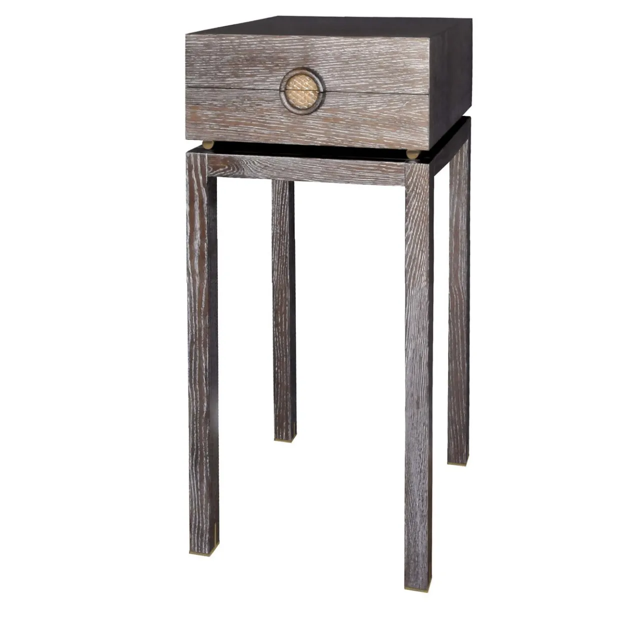 Come comodino o accostato a un divano, questo tavolino alto si fa notare per la sua silhouette semplice ed elegante, realizzata in rovere tinto nei colori argento e marrone cioccolato. Distanziali in bronzo galvanizzato sospendono il piano dalla base a quattro gambe e una maniglia ad anello nella stessa finitura circonda il bordo dei due cassetti con chiusura ammortizzata, aggiungendo un sottile tocco di glamour.