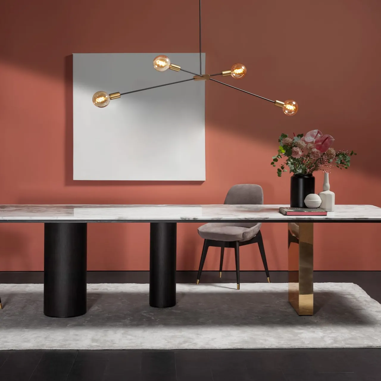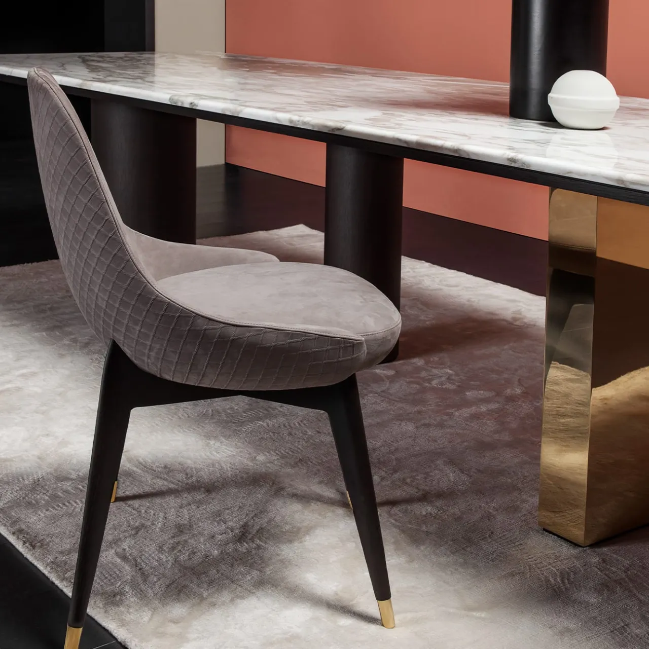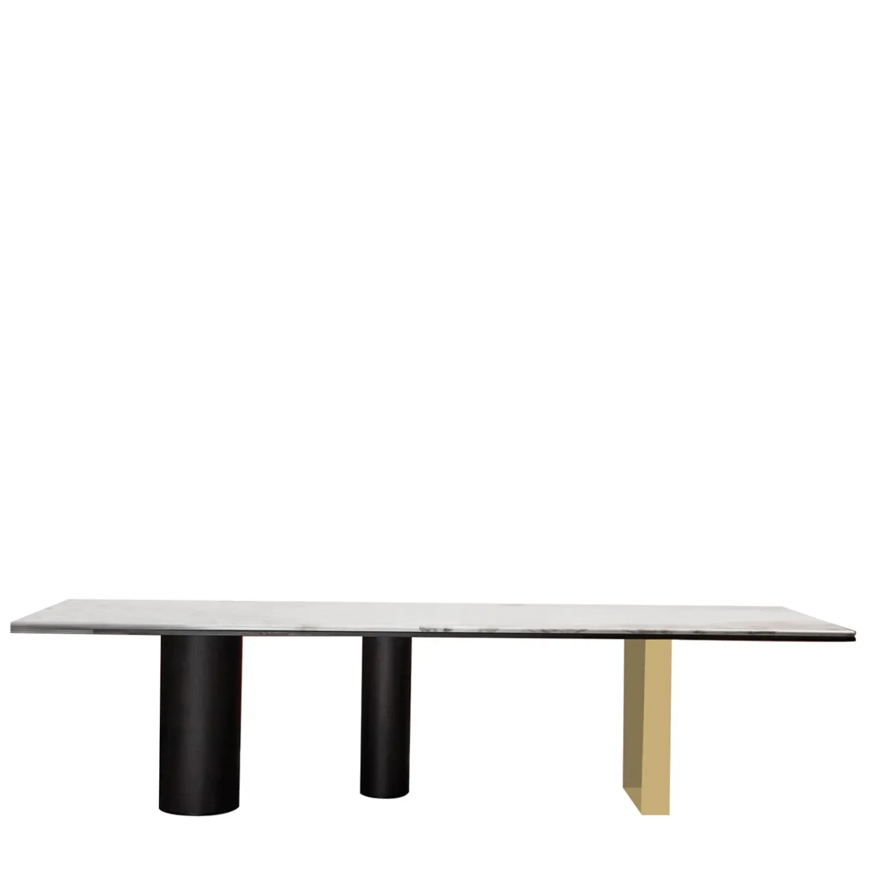 Un esercizio di volumi geometrici sapientemente disposti in un impeccabile stile contemporaneo definisce questo meraviglioso tavolo da pranzo, un pezzo maestoso che completa la casa moderna. Lo splendido piano in marmo Calacatta contrasta con le due gambe cilindriche di dimensioni diverse rifinite in grigio intenso, mentre la terza gamba è in legno rivestito in ottone lucido. Rigoroso ma affascinante. Il sottopiano è realizzato in pregiato rovere tinto grigio.