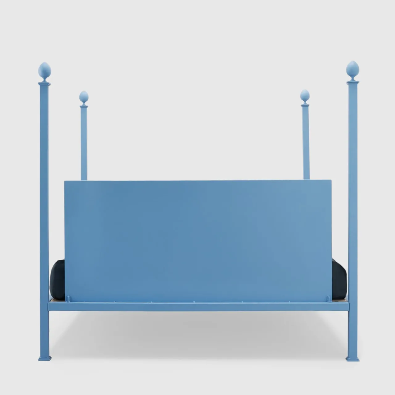 Evocato con audacia dai suoi montanti che culminano in elementi decorativi torniti che ricordano i vescovi, questo letto matrimoniale è un’elegante sintesi di riferimenti antichi e contemporanei. I montanti – la cui sezione quadrata misura 5×5 cm – tracciano la robusta struttura a baldacchino in ferro, il cui carattere imponente è reso fresco da una solida finitura azzurra. Incastonata in una cornice rettangolare, la testata in lamiera insonorizzata favorisce momenti di impeccabile relax.