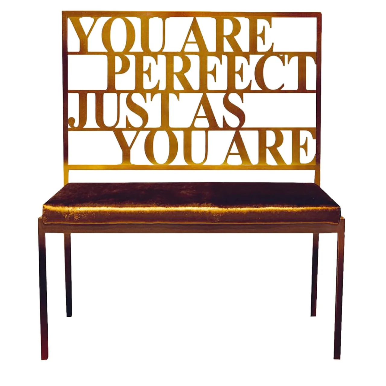 Un promemoria quotidiano dell’amore per se stessi sotto forma di panca, questa panca artigianale si distingue per il suo design eloquente. Coerente con la collezione Imperfect Love a cui appartiene, la sua struttura minimalista in ferro dorato ha il messaggio “sei perfetto così come sei” incorporato nello schienale, una dichiarazione che può essere osservata più da vicino quando ci si siede sulla morbida seduta rivestita in velluto coordinato.