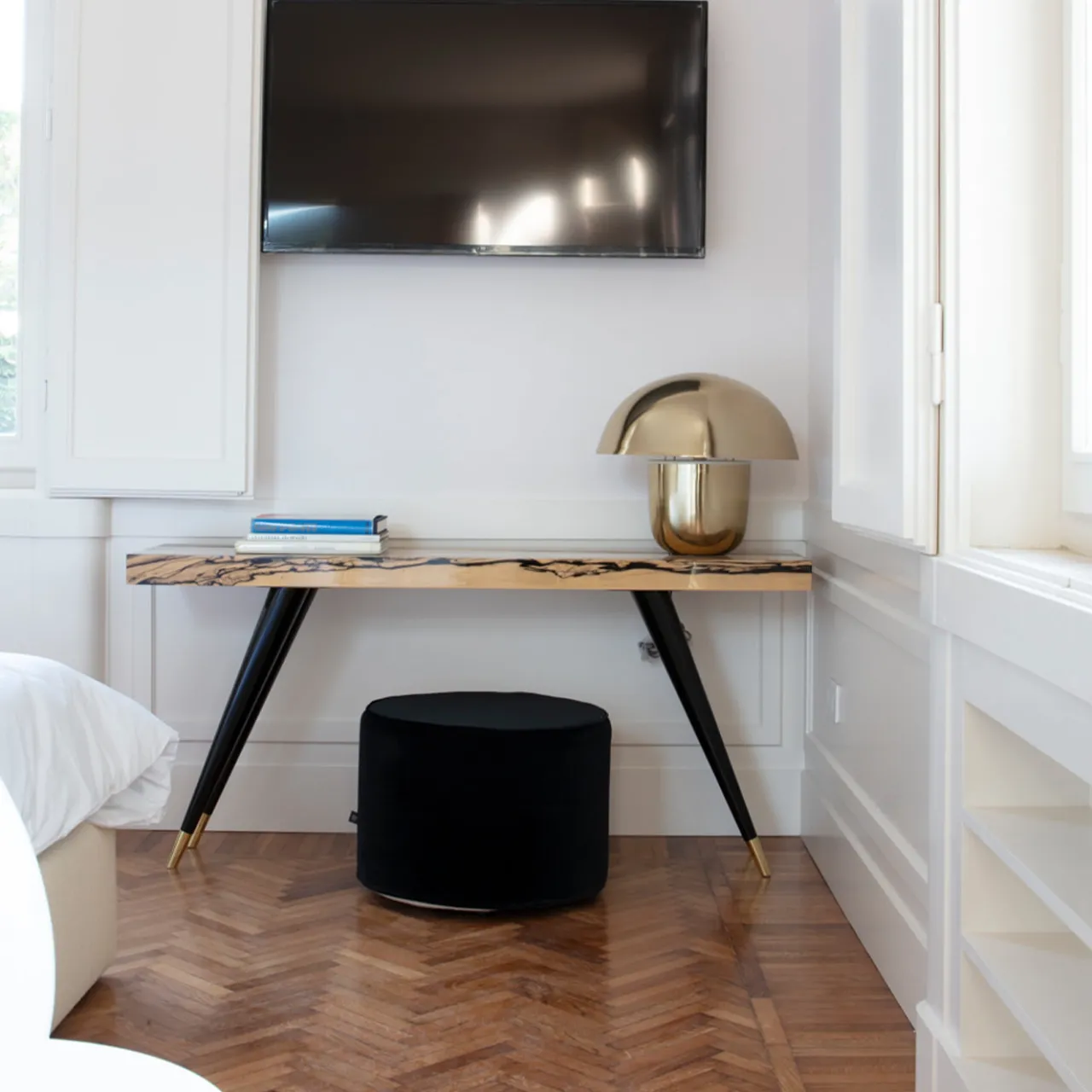 Questa splendida consolle della serie Andrea ha come caratteristica principale il piano di altissimo spessore in pregiato ebano albino, con venature mozzafiato che emanano un fascino sofisticato. Ideale come superficie espositiva in un ingresso moderno o contemporaneo, la base di sostegno in legno è composta da due gambe inclinate e coniche laccate in nero lucido, i cui piedi sono accentati da punte di ottone lucido per un tocco sottile.