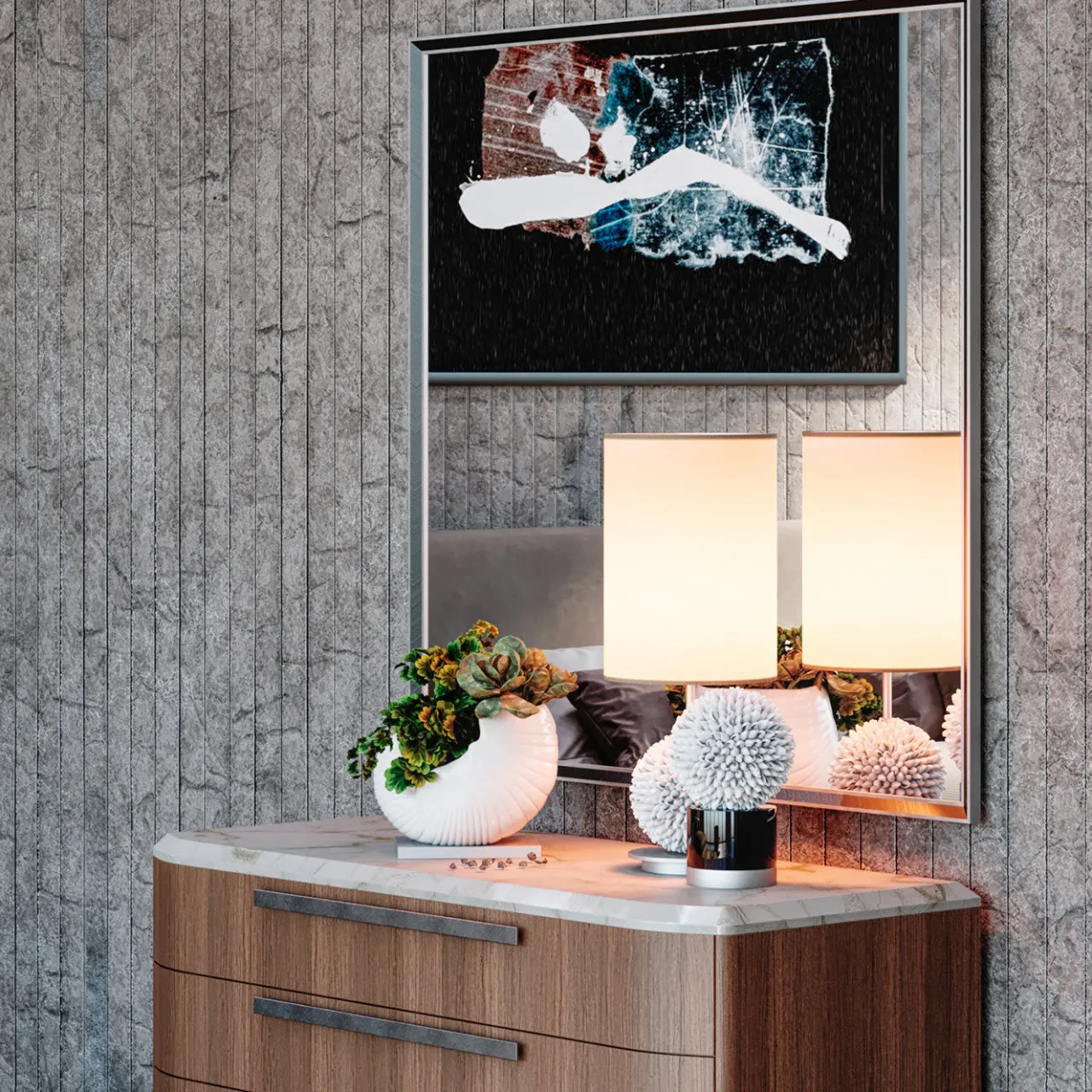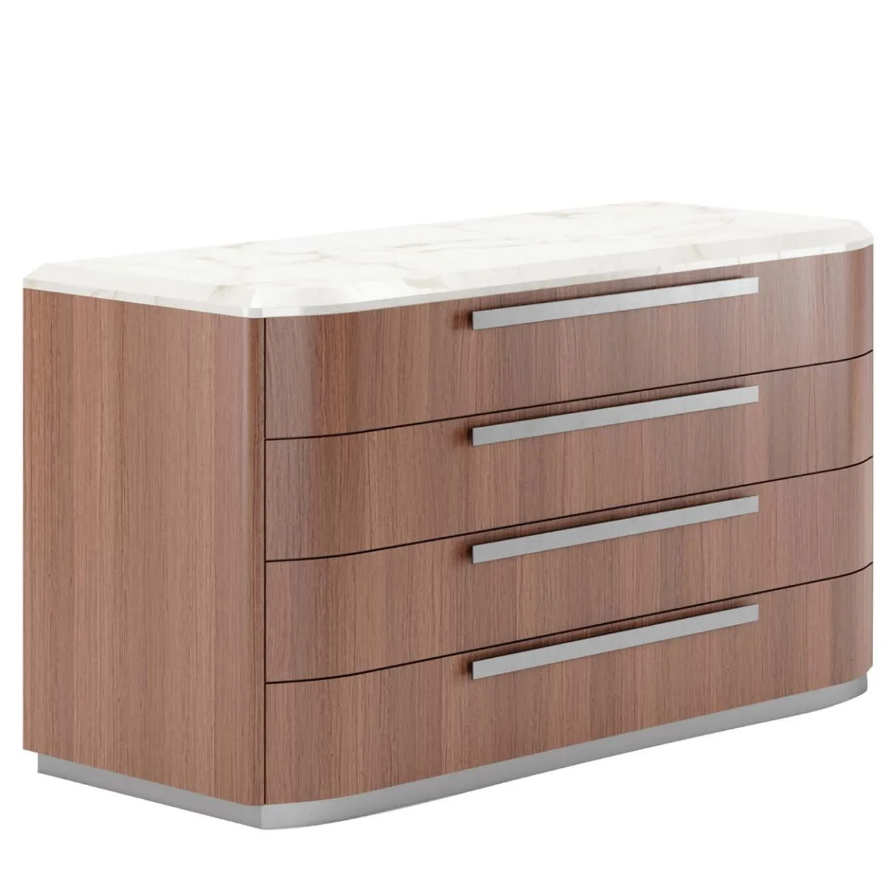 Caratterizzato da una silhouette arrotondata e priva di spigolosità, questo raffinato comò in legno vanta una preziosa impiallacciatura in noce per i fianchi e i quattro cassetti. Il piano luminoso in pregiato marmo bianco esalta la luminosità delle maniglie in metallo dritto con finitura titanio, abbinate alla base del comò.