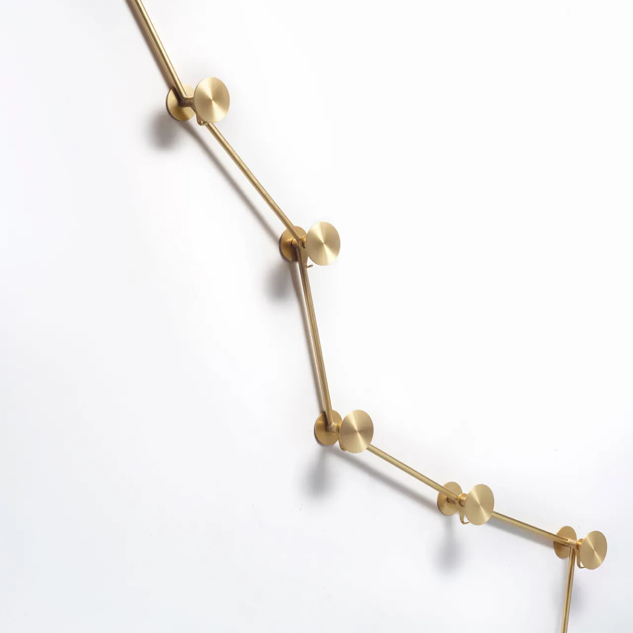 Ispirato all’appendiabiti vintage in legno a fisarmonica, questo appendiabiti è realizzato in ottone satinato con una struttura flessibile che può essere modellata per adattarsi alle esigenze degli interni e all’estetica individuale. Questo design moderno presenta sei piccoli pomelli (6 cm) con un gancio e un grande disco su un lato. È disponibile anche in acciaio inox con finitura lucida o annerita e con uno specchio rotondo che sostituisce il pomello più grande. La lunghezza è di 165 cm con una sporgenza dalla parete di 6,5 cm.