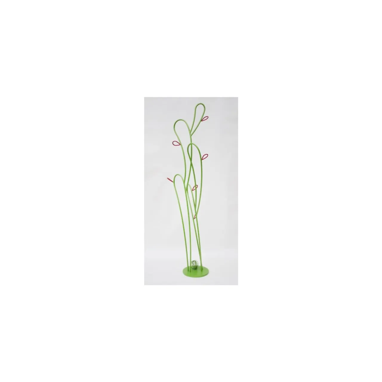 Colori vivaci e linee sottili delineano il profilo aggraziato e arioso di questo appendiabiti, realizzato artigianalmente in ferro e ispirato ai tipici paesaggi pugliesi punteggiati di fichi d’India. Rappresentazione artistica di un fico d’india, il design vanta una distribuzione d’impatto di volumi lisci laccati in verde chiaro e dotati di elementi laccati in rosso che rappresentano i frutti e fungono da supporto per cappotti, giacche o cappelli. Una base circolare completa la silhouette.