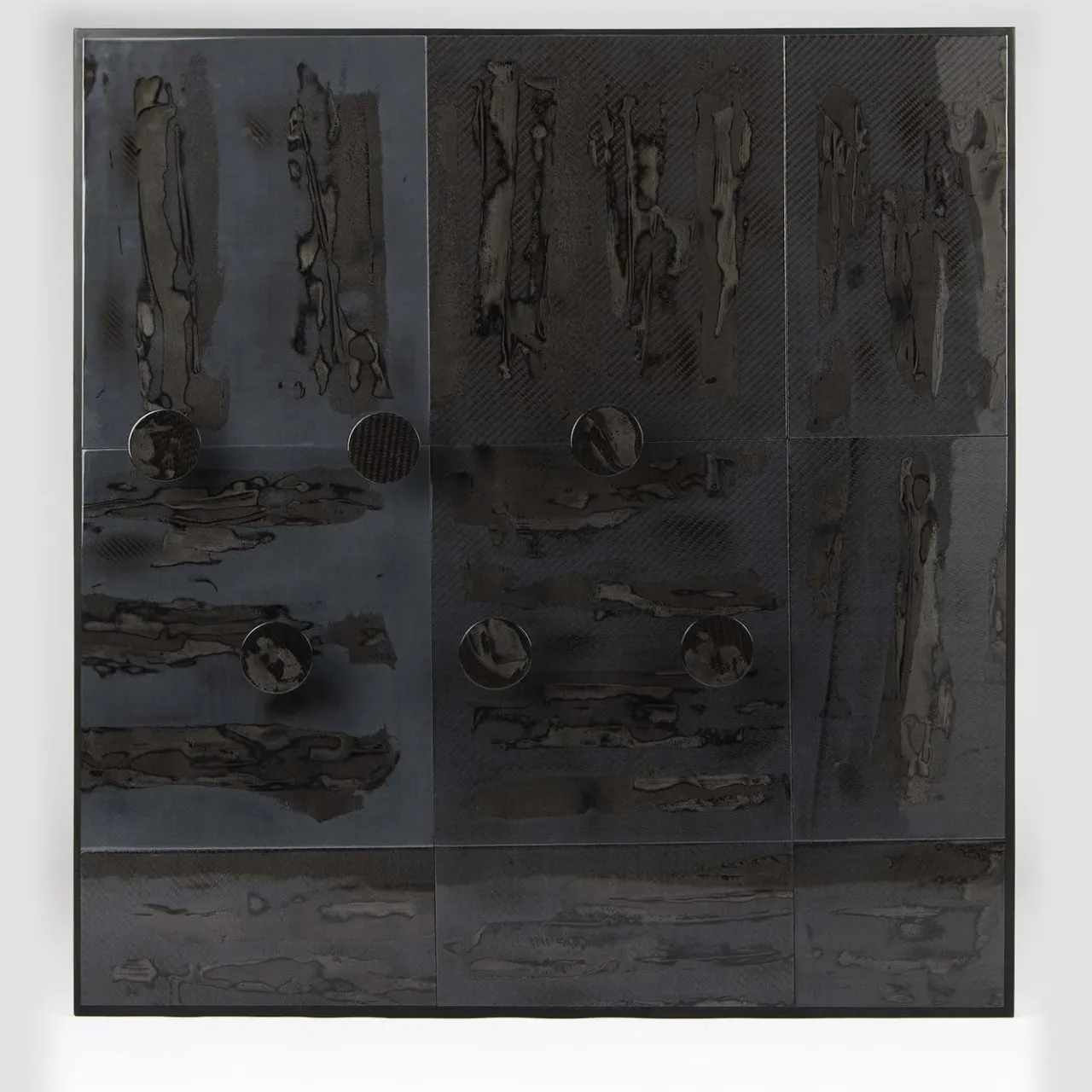 Questo appendiabiti elegante e unico fa parte della collezione Sorry Jannis, un omaggio al lavoro di Jannis Kounellis e direttamente ispirato all’Arte Povera. Interpretazione contemporanea di questo movimento d’arte moderna, questo splendido oggetto è funzionale ma anche una sorprendente decorazione da parete. È composto da diversi pannelli realizzati con un materiale sviluppato in esclusiva da Frisoli: il Frisoli Lachesi, in cui il grigio intenso della fibra di carbonio si mescola alla tonalità azzurra della fibra di vetro. Su questo mix viene versato materiale aerospaziale, creando un effetto unico che contraddistingue ogni pannello.