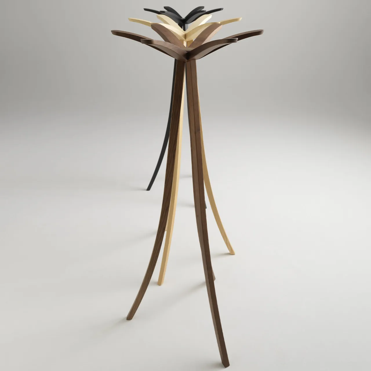Questo appendiabiti è un pezzo squisito di arredamento funzionale, caratterizzato da una scultura minimalista, che si adatta a spazi residenziali e commerciali. Realizzato in legno di frassino tinto noce, la sua struttura a tre gambe si collega alle estremità, formando dei pioli per appendere cappotti e accessori.