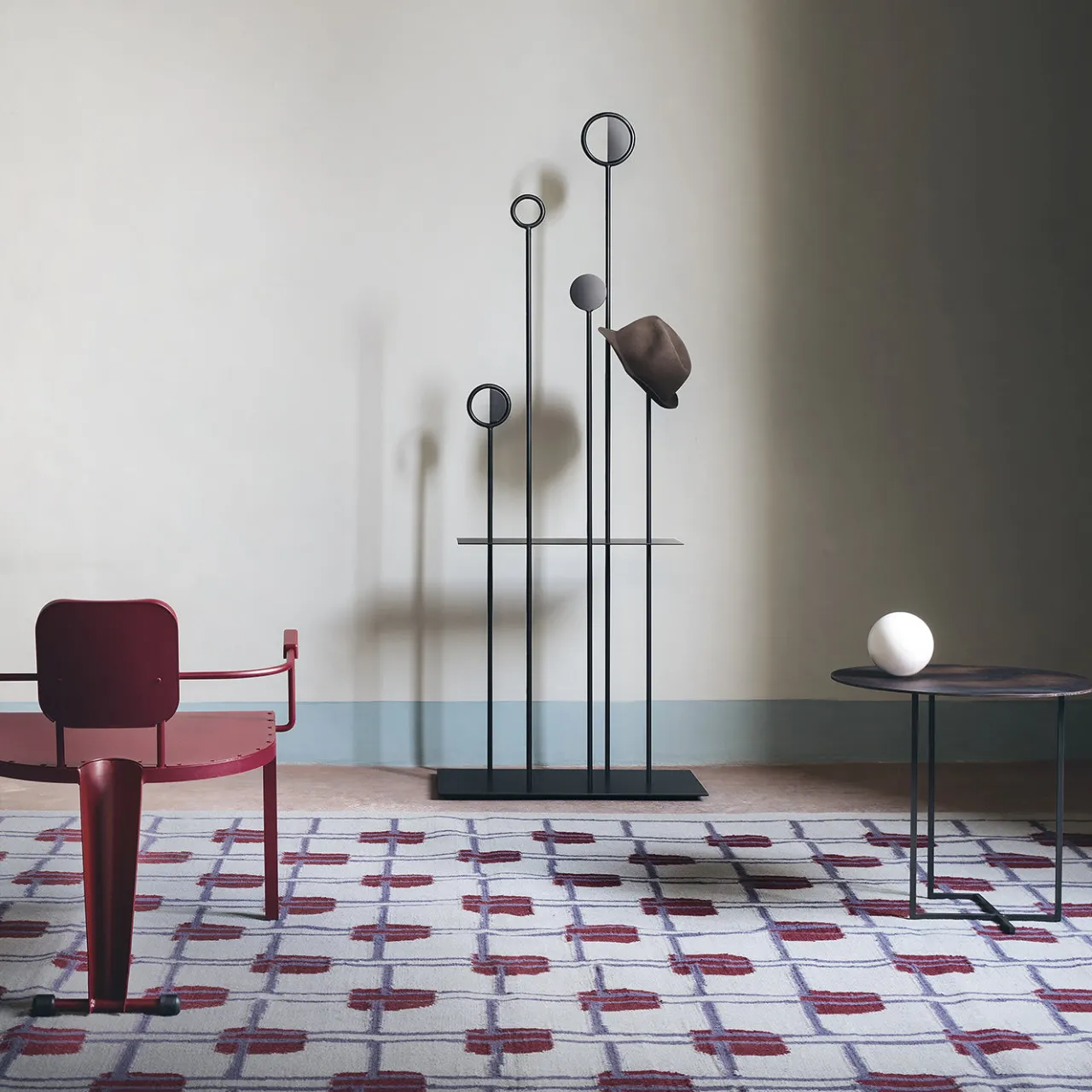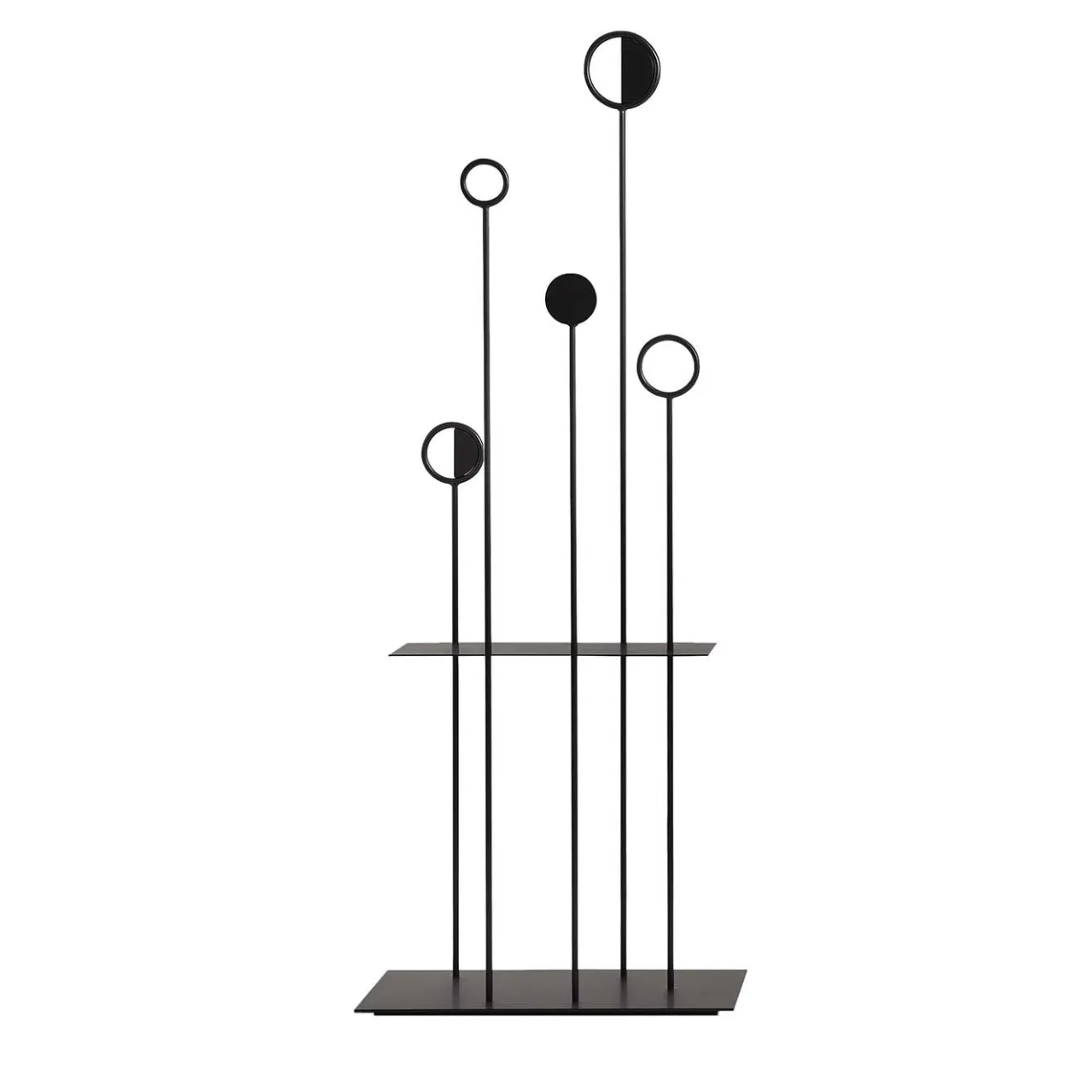 Parte di una serie di appendiabiti a culla che trae ispirazione dalle carte da gioco, questo splendido appendiabiti è una scultura moderna dall’allure raffinata ed esclusiva. Interamente realizzato in acciaio tagliato al laser, è composto da sottili aste che terminano con cerchi che si estendono da una solida base rettangolare in acciaio. Un ripiano centrale è progettato come tasca vuota per raccogliere oggetti vari. Con una finitura nera liscia, questo pezzo è disponibile in altri colori, sia per uso interno che esterno.