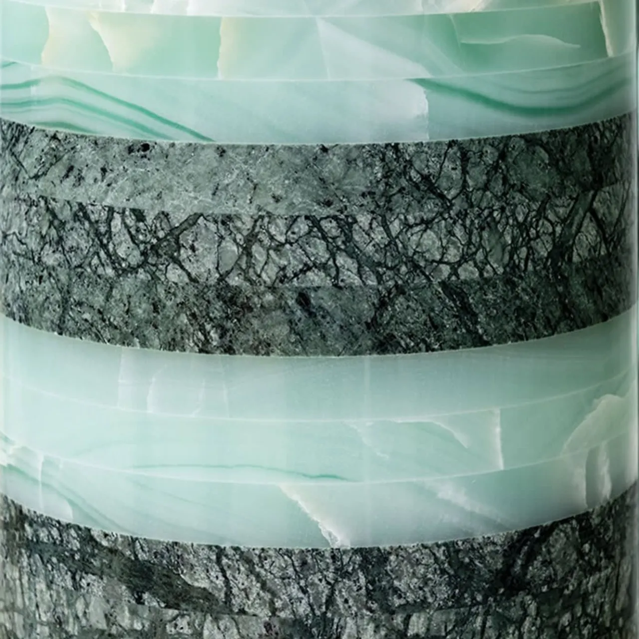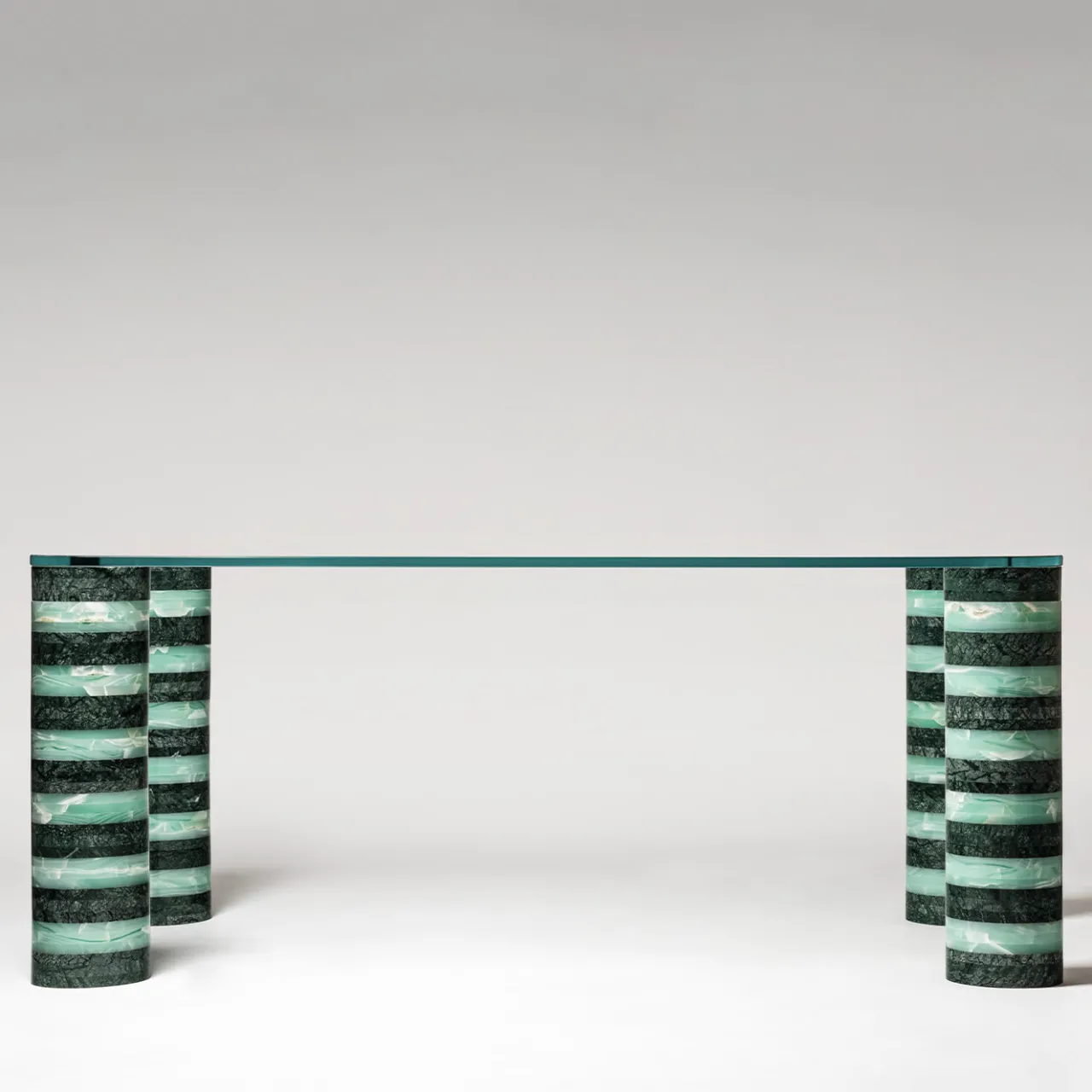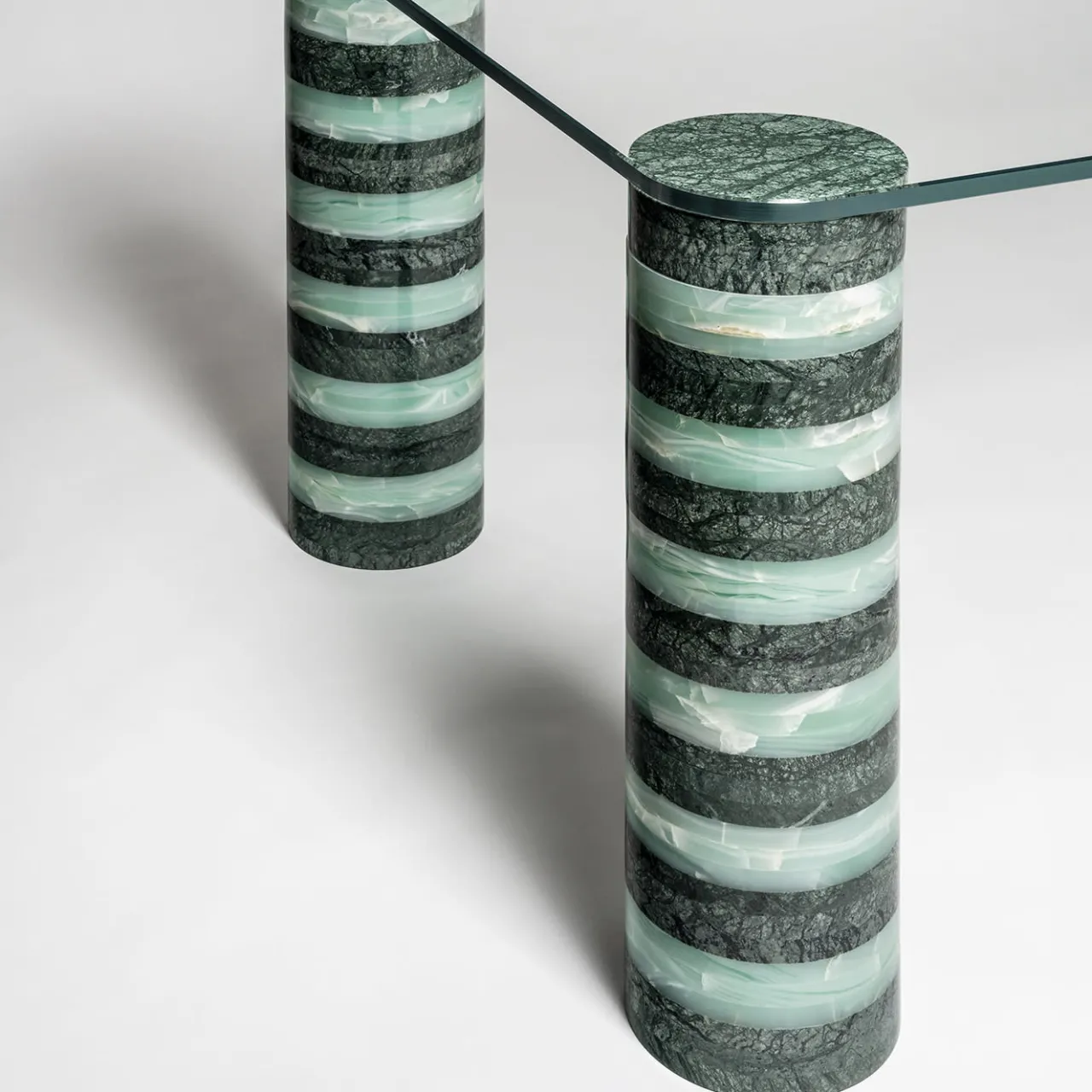 Il tavolo Architexture Living Table 01 è composto da quattro gambe a colonna, formate da anelli alternati in marmo Verde Guatemala e Onice Menta Aquarel. Il marmo verde monocromatico, privo di venature, contrasta con la luminosità e la delicata “nuvolatura” dell’onice verde chiaro. Il piano rettangolare in vetro extrachiaro segue le forme delle gambe, lasciando trasparire il primo cerchio Verde Guatemala della colonna.