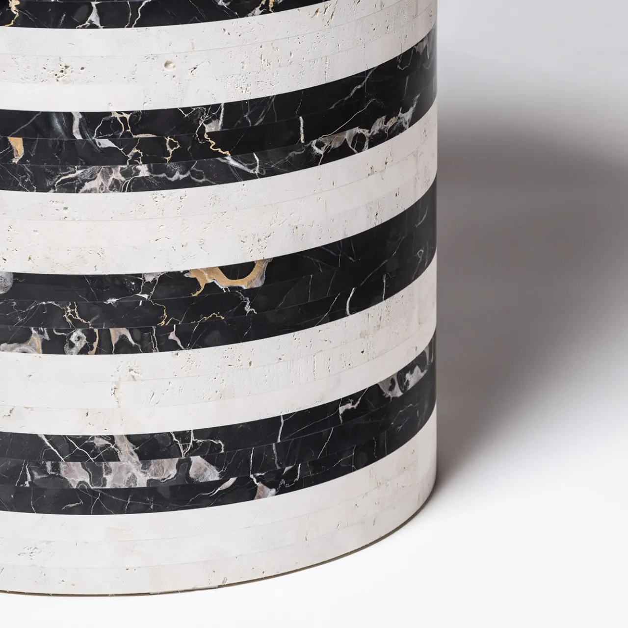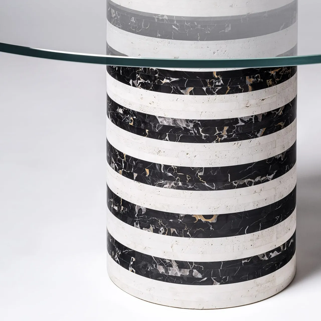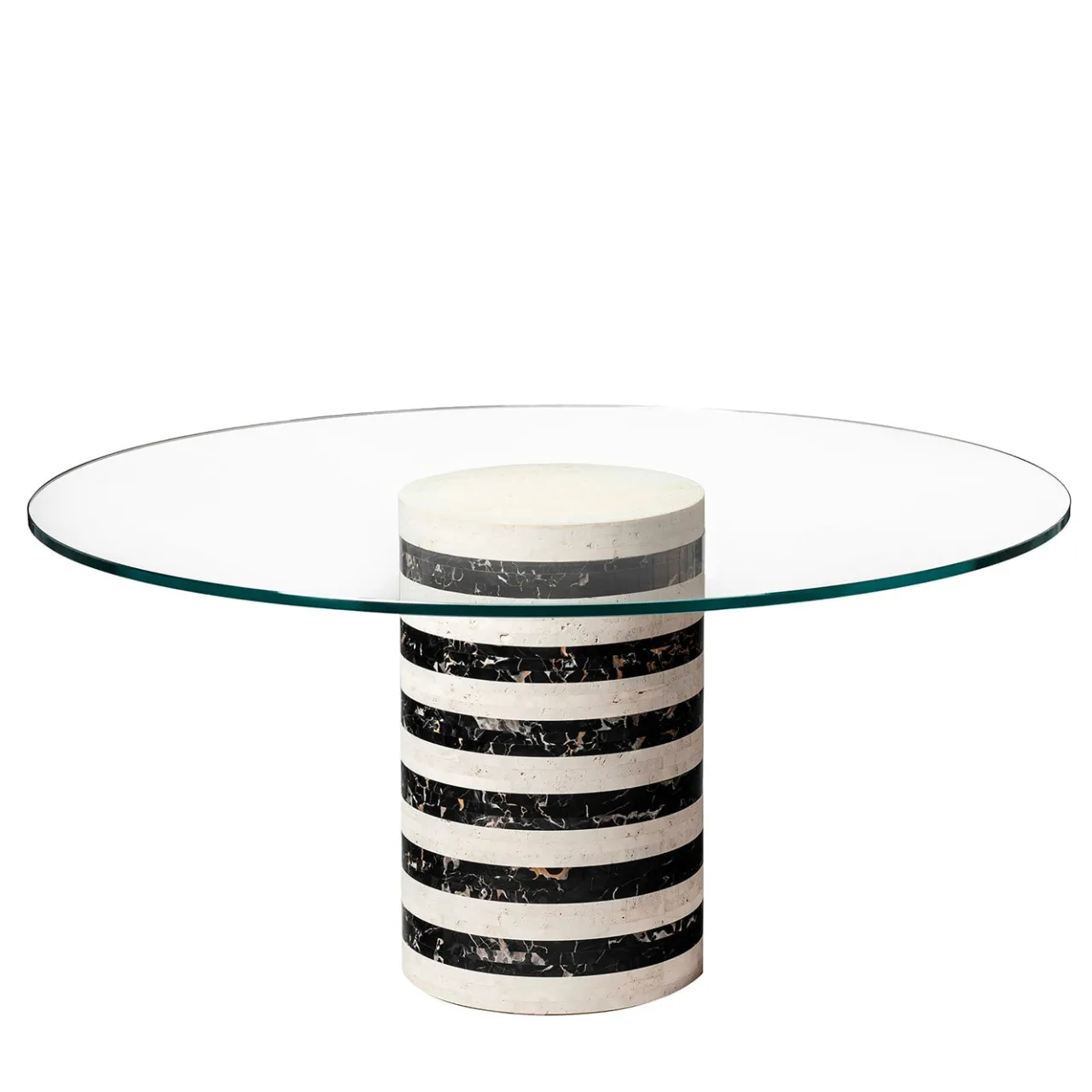 Tavolo Living circolare composto da un’unica gamba centrale, una grande colonna in Nero Portoro e Travertino Romano Classico. Il Travertino è volutamente lasciato a poro aperto con una finitura sabbiata per contrastare la lucentezza del Nero Portoro, un prezioso marmo italiano estratto a Portovenere in Liguria, dalle caratteristiche venature dorate. Questo materiale pregiato crea un contrasto inaspettato con il Travertino color sabbia ed extra opaco. L’ampio cerchio superiore in Travertino emerge dal piano in vetro extra chiaro.