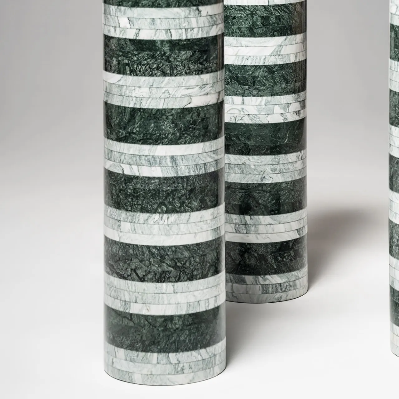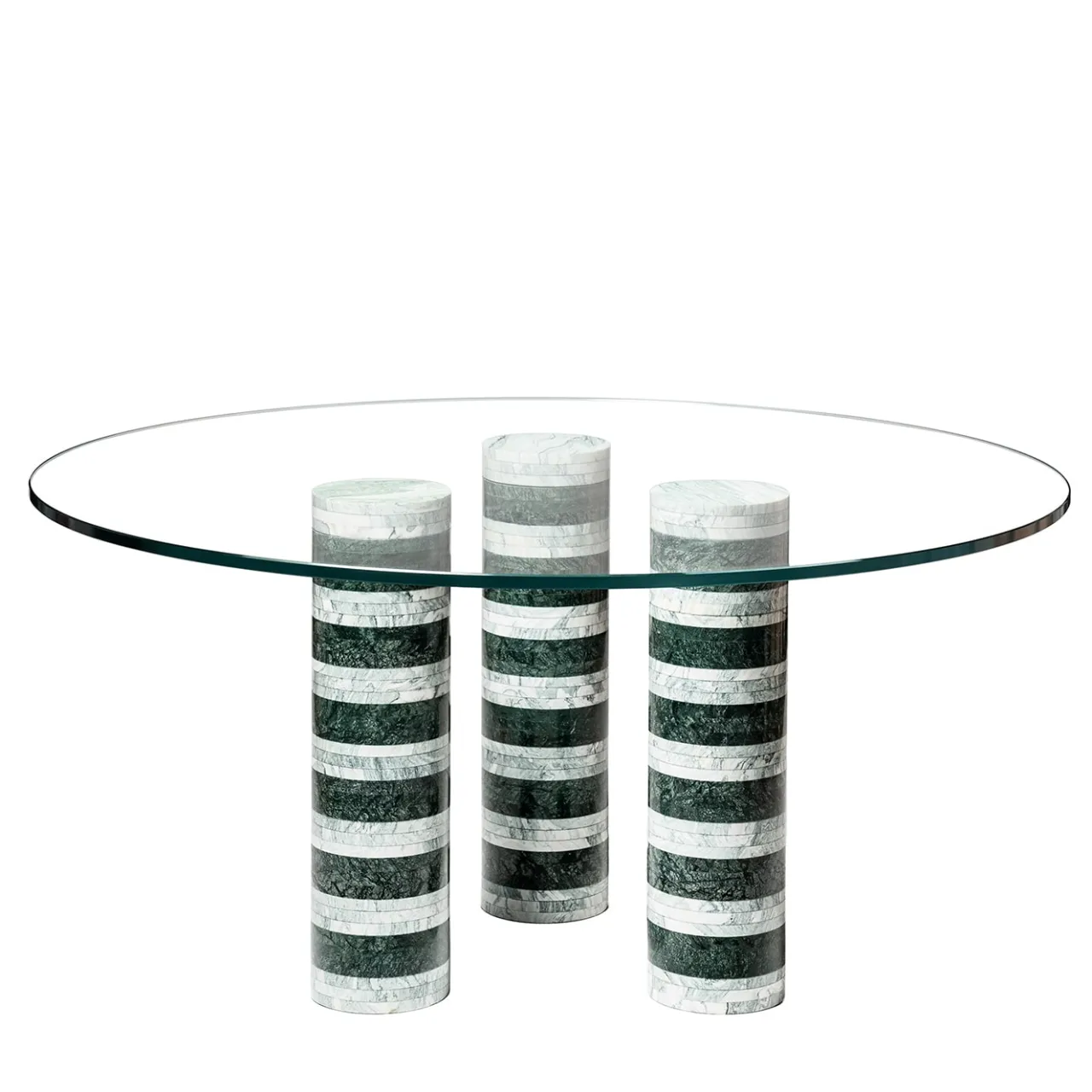 Tavolo Living circolare con tre gambe a colonna centrale composte da anelli in marmo Verde Cipollino e Verde Alpi in sequenza simmetrica. Il Verde Cipollino, materiale pittorico ricco di venature, estratto dalle Alpi Apuane della Toscana, si contrappone al Verde Alpi, volutamente scelto monocromatico per creare un effetto color-block. I tre cerchi venati di Verde Cipollino spiccano dal piano in vetro extrachiaro.