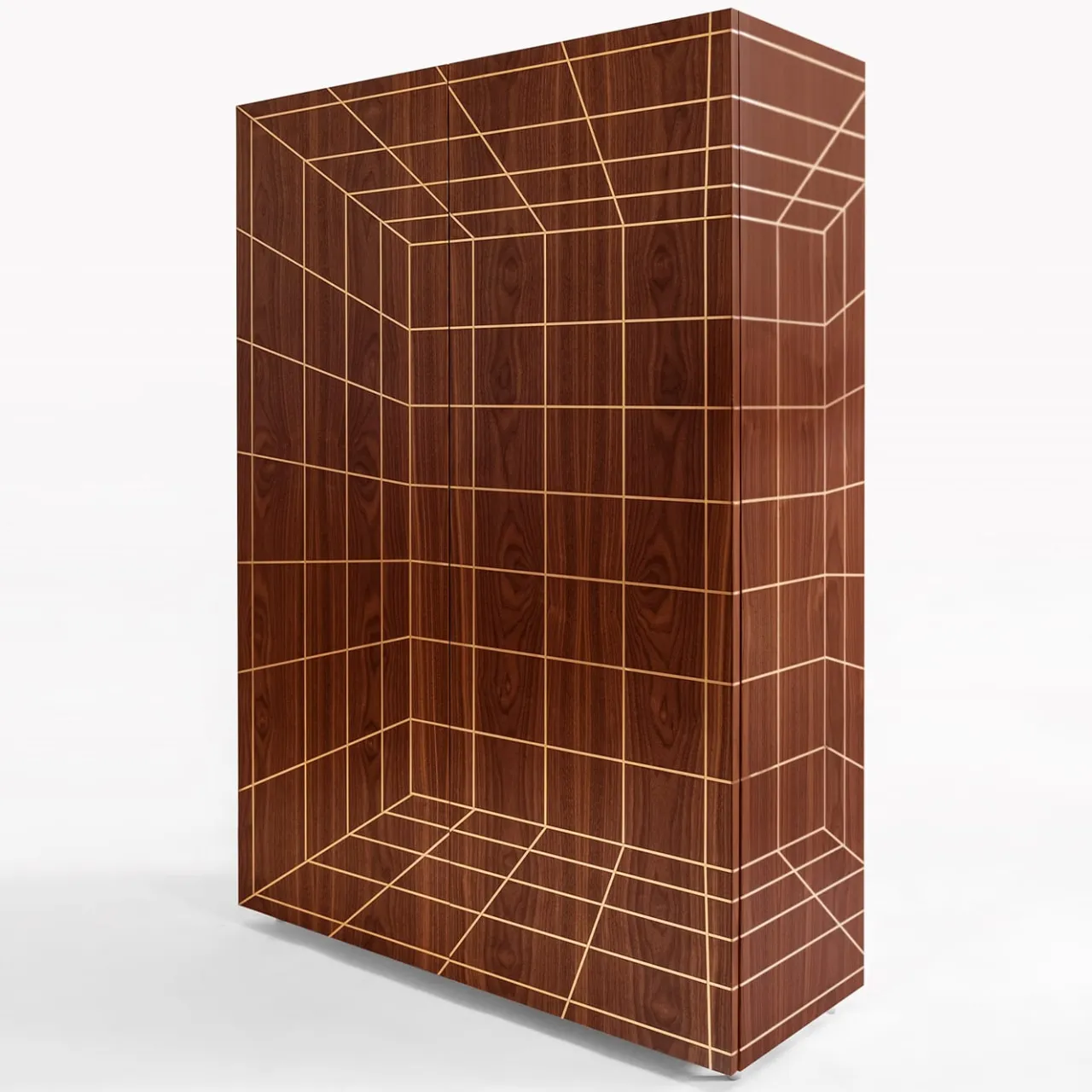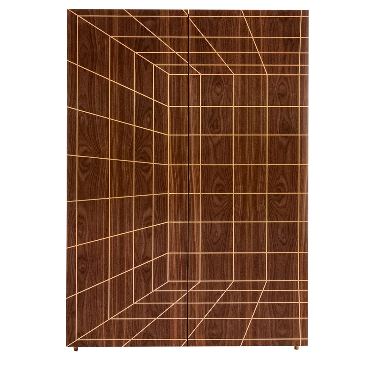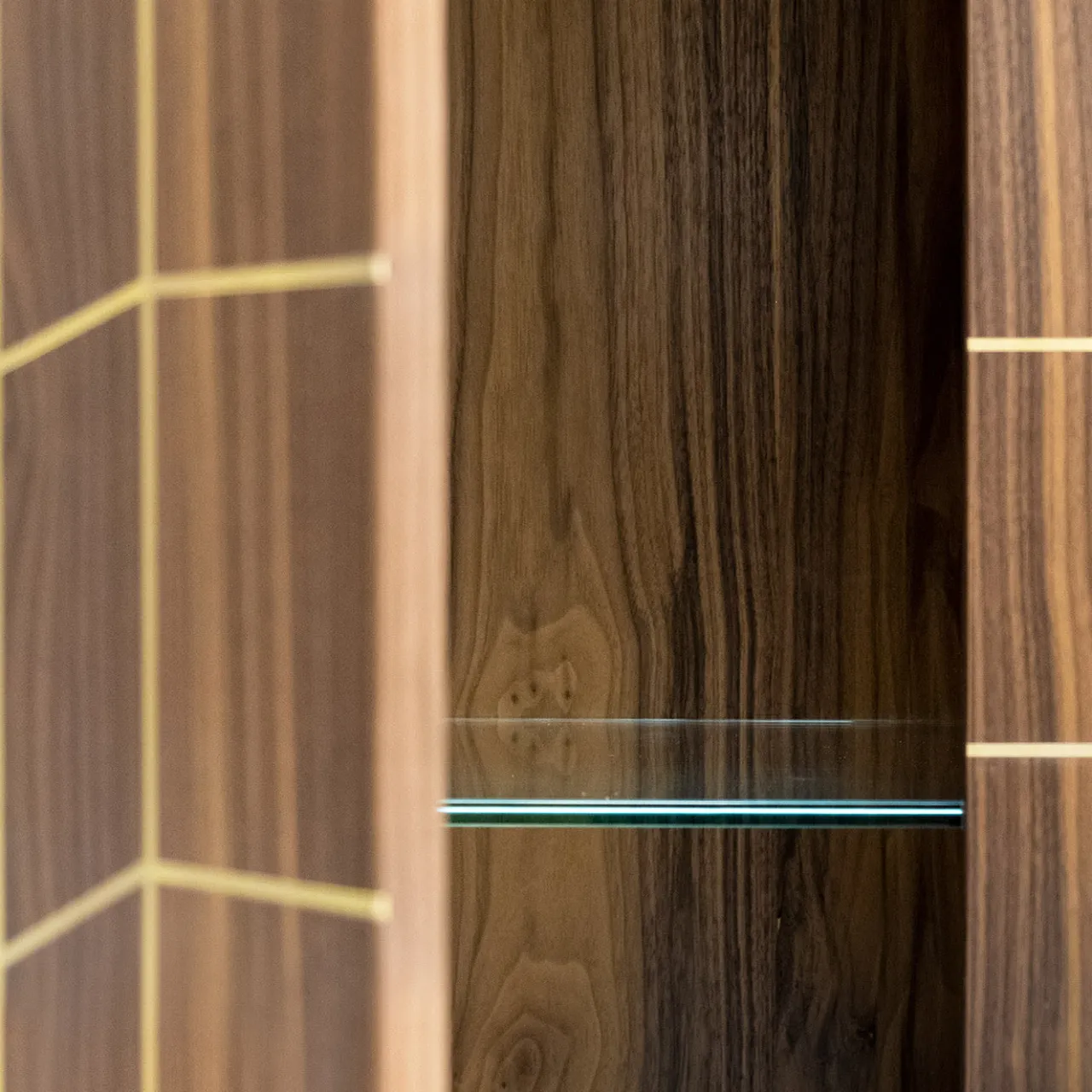 Prospecto è una collezione di contenitori le cui superfici in legno sono solcate da sottili profili in ottone. L’antica tecnica dell’intarsio viene riproposta per generare nuovi effetti tridimensionali e prospettive. Materiali Struttura in listellare impiallacciato noce canaletto verniciato trasparente; inserti e piedini in ottone, ripiani in vetro temperato extrachiaro da 10 mm.