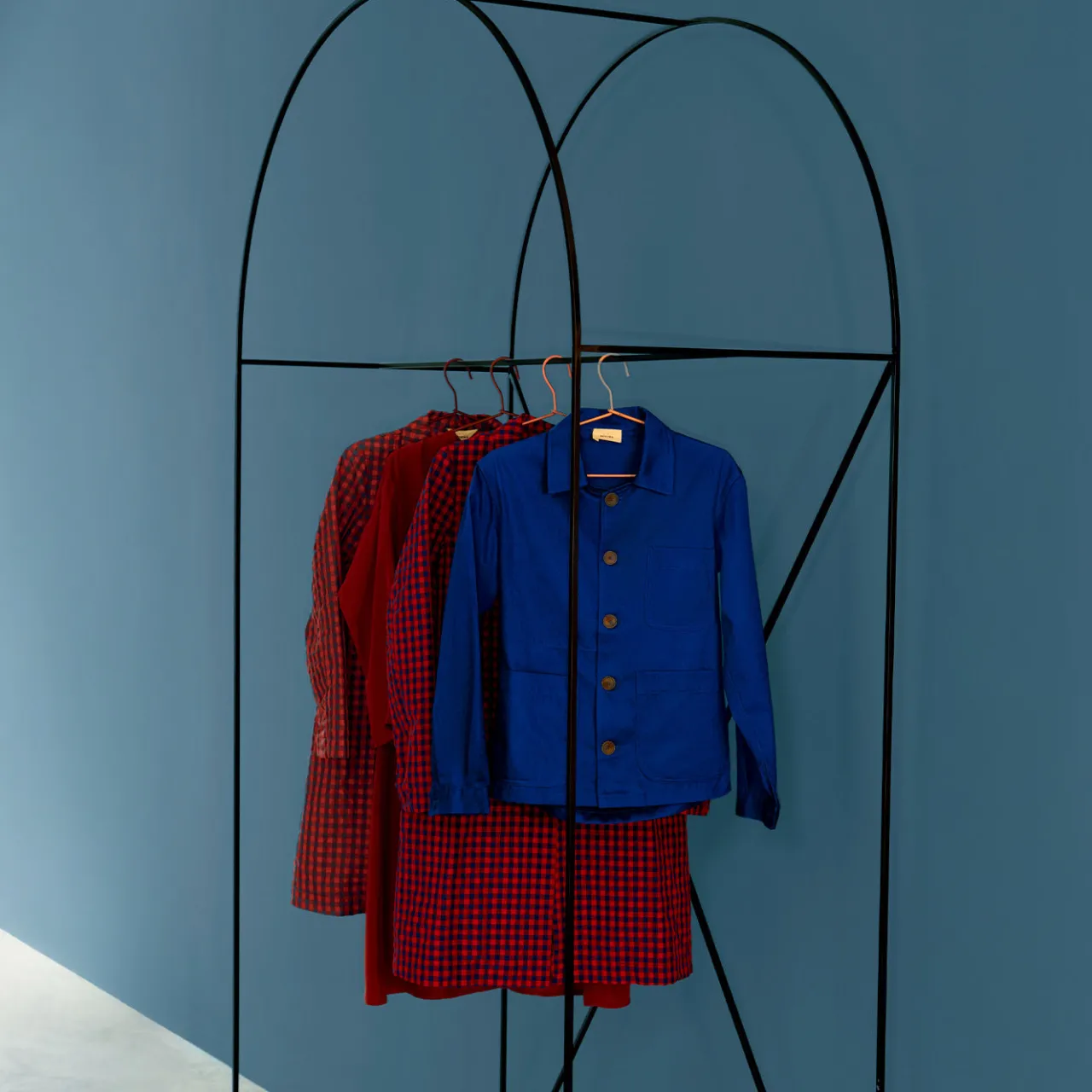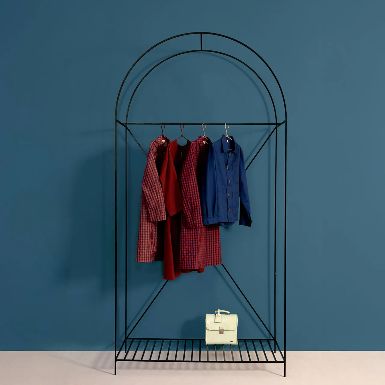 Questo appendiabiti, raffinato design contemporaneo che reinventa ad arte i mobili tradizionali, è caratterizzato da una sorta di volume fantasma in cui si mantiene solo lo scheletro di un armadio. La sua struttura, costituita da tondini di ferro saldati, trasmette contemporaneamente un senso di ariosità e di robustezza. Il top ad arco sottolinea l’armonia, ammorbidendo le composizioni altrimenti rigorose. Le grucce Ella completano idealmente il design.