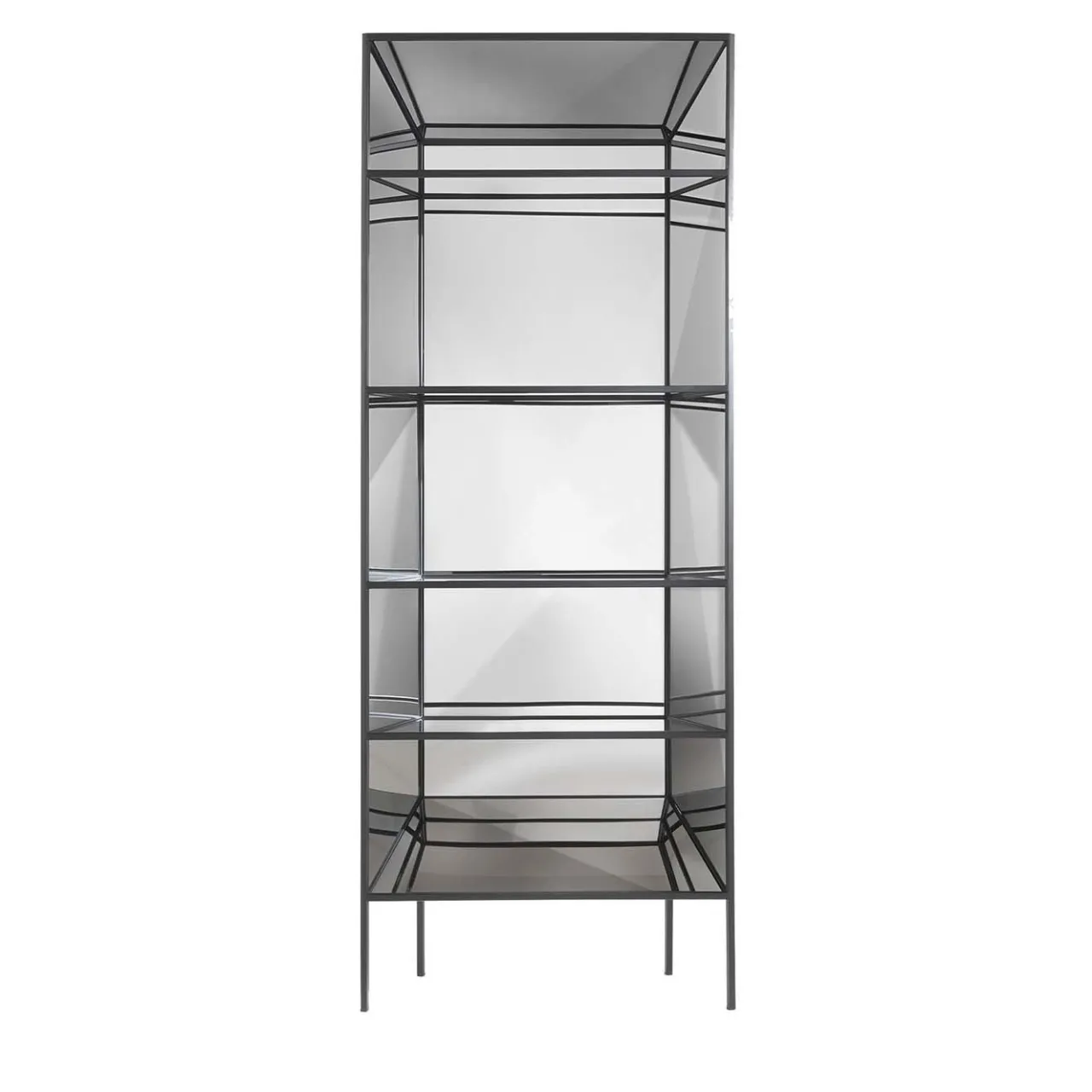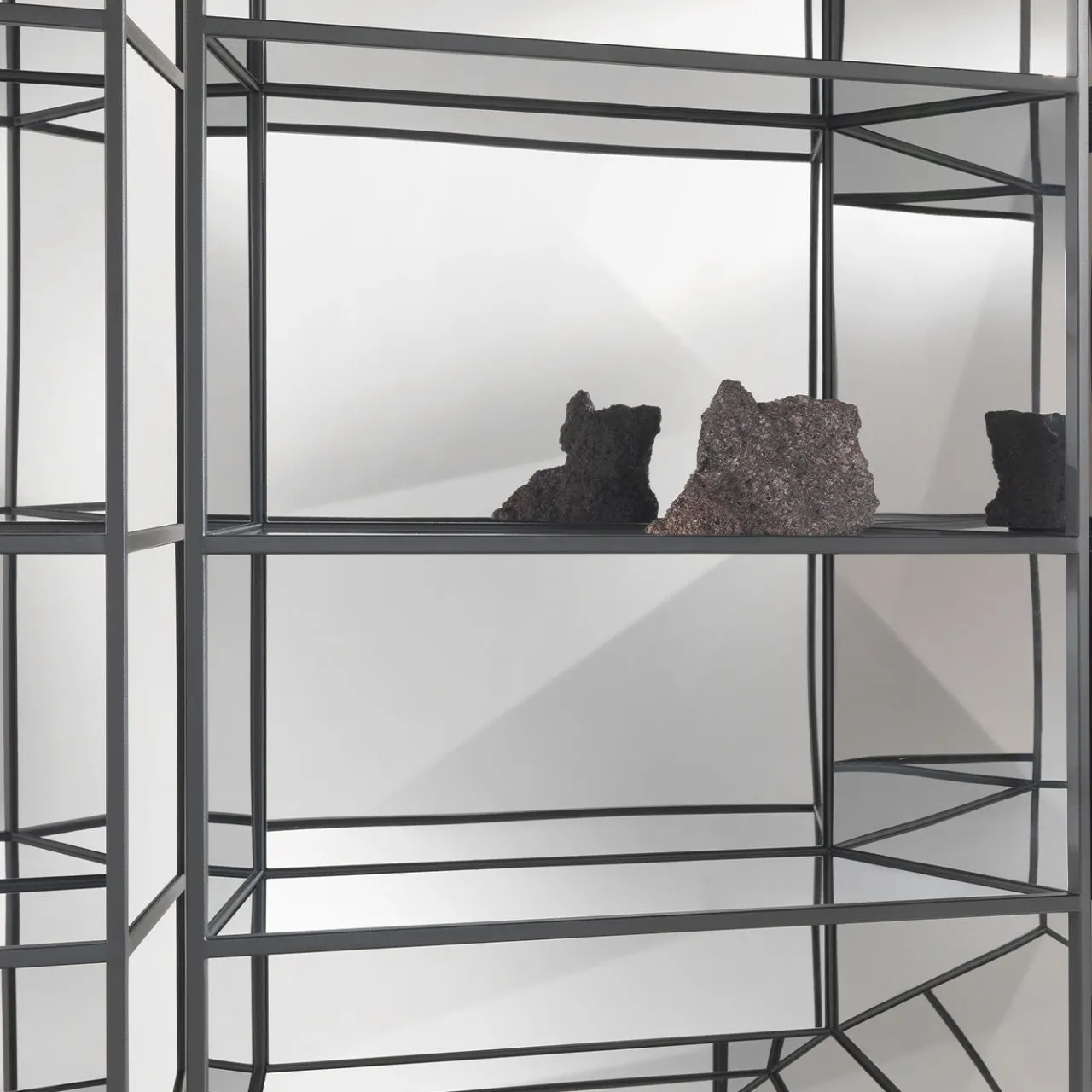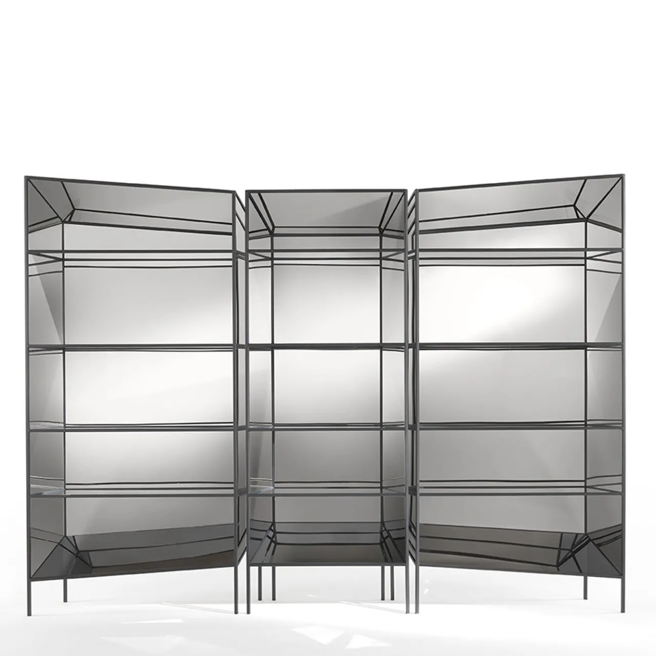 “Un gioco di specchi che rivela nuove dimensioni. Ispirato alle incisioni medievali e rinascimentali sull’illusione ottica e sul senso di profondità, Perflect è un insieme di librerie-armadi realizzati con strutture sottili ed eleganti le cui superfici specchiate moltiplicano gli oggetti collocati all’interno, suggerendo realtà alternative.” Libreria con struttura metallica in finitura nera goffrata. Tutte le superfici sono rivestite con pannelli in acciaio supermirror. Nessuna variante disponibile.