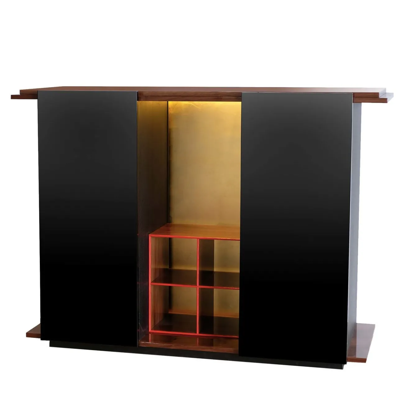 Disponibile in 10 colori diversi, questo mobile ha un design accattivante definito da un coinvolgente gioco tra spazi aperti e chiusi. Il piano e la base in caldo noce canaletto incontrano la finitura fredda delle unità laterali in poliuretano nero lucido, separate da un vano aperto con sfondo in foglia d’oro (anche argento e rame) che ospita un ripiano a cubo in rovere tinto rosso lucido. L’illuminazione a LED completa questo pezzo di grande effetto.