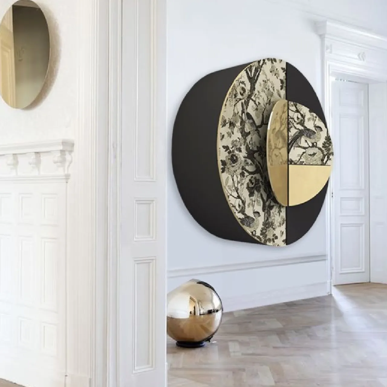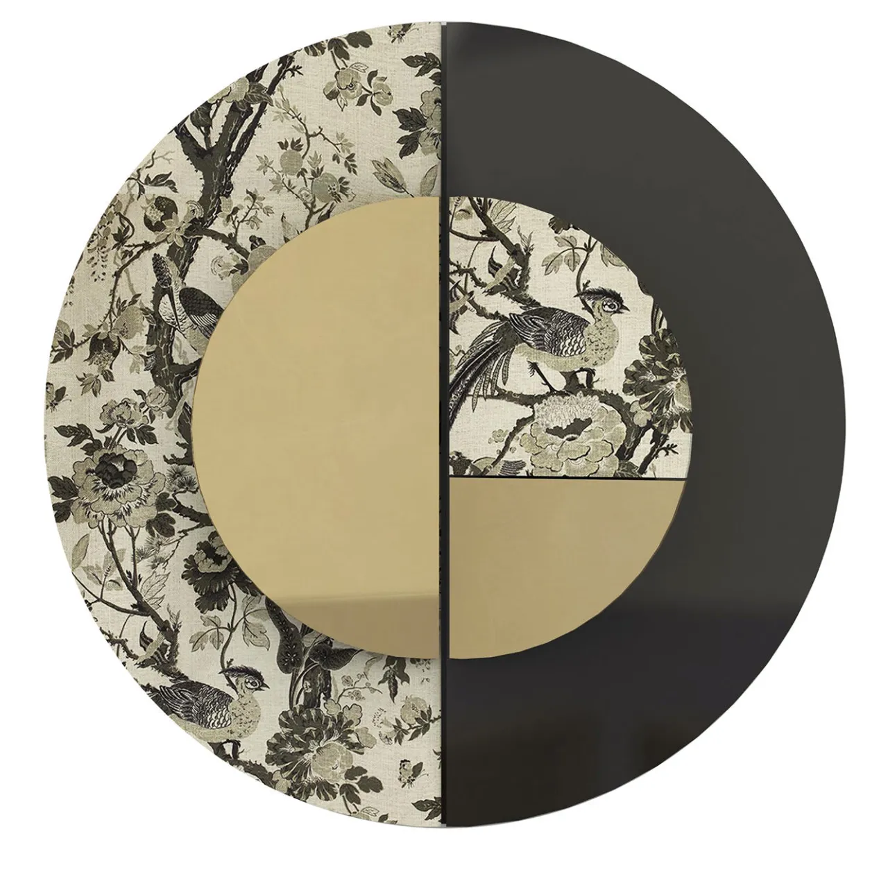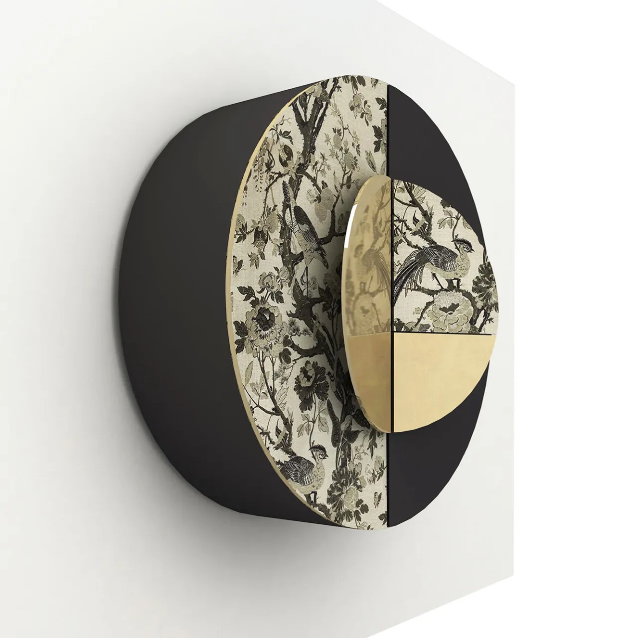 Dal design elegante e contemporaneo, questo mobile a muro vanta una silhouette rotonda realizzata con materiali raffinati. La struttura in legno nero lucido è in parte rivestita con un raffinato tessuto orientale realizzato a mano con antichi telai e presenta maniglie rotonde in ottone rifinito in oro, anch’esse in parte rivestite con lo stesso tessuto. L’interno in legno è arricchito da ripiani in vetro fumé e da uno specchio sul fondo.