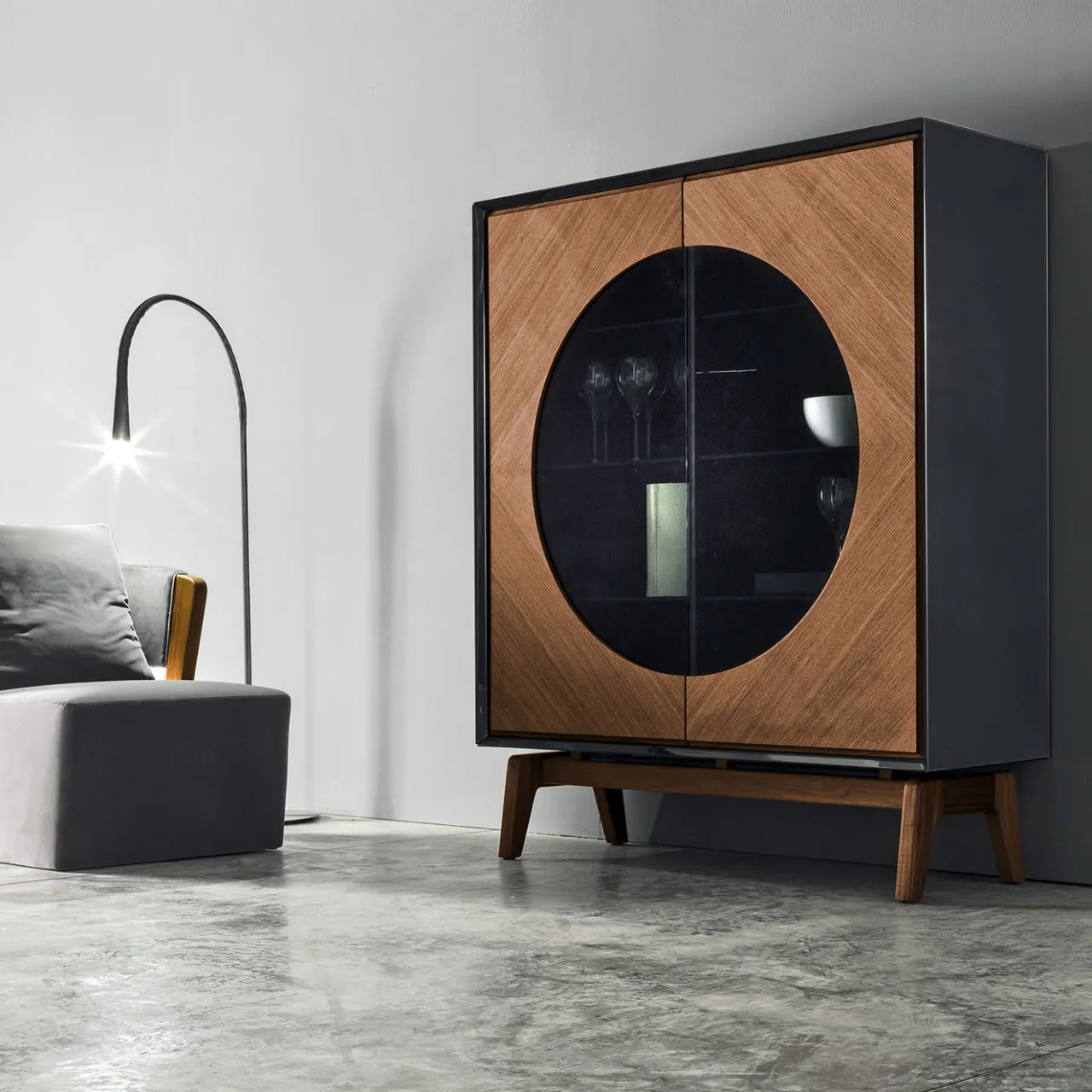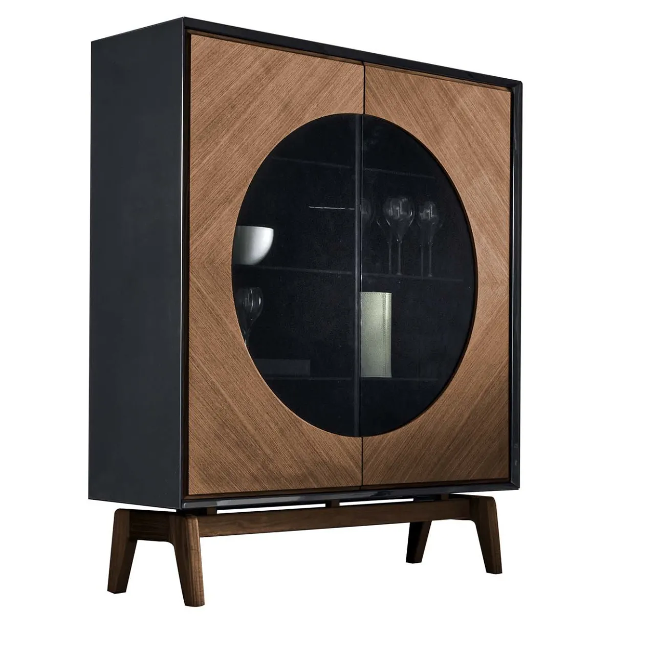 Superbo oggetto di arredamento funzionale, questa credenza alta è una celebrazione dei materiali naturali e dei contrasti di colore. Le sue gambe inclinate, ispirate al design di metà secolo, sostengono una struttura che combina volumi lineari e curve sorprendenti. La struttura è verniciata esternamente in nero lucido, mentre i pannelli frontali sono impreziositi da due elementi semicircolari in vetro fumé. Le gambe e le ante sono in noce canaletto opaco. All’interno, sei ripiani in vetro offrono un versatile spazio di archiviazione.