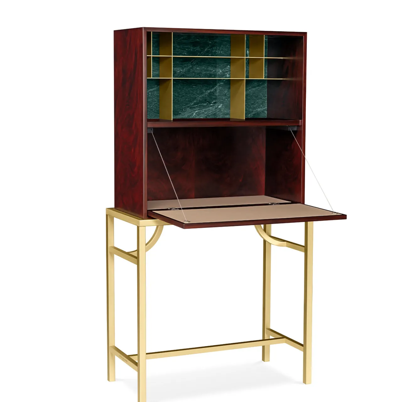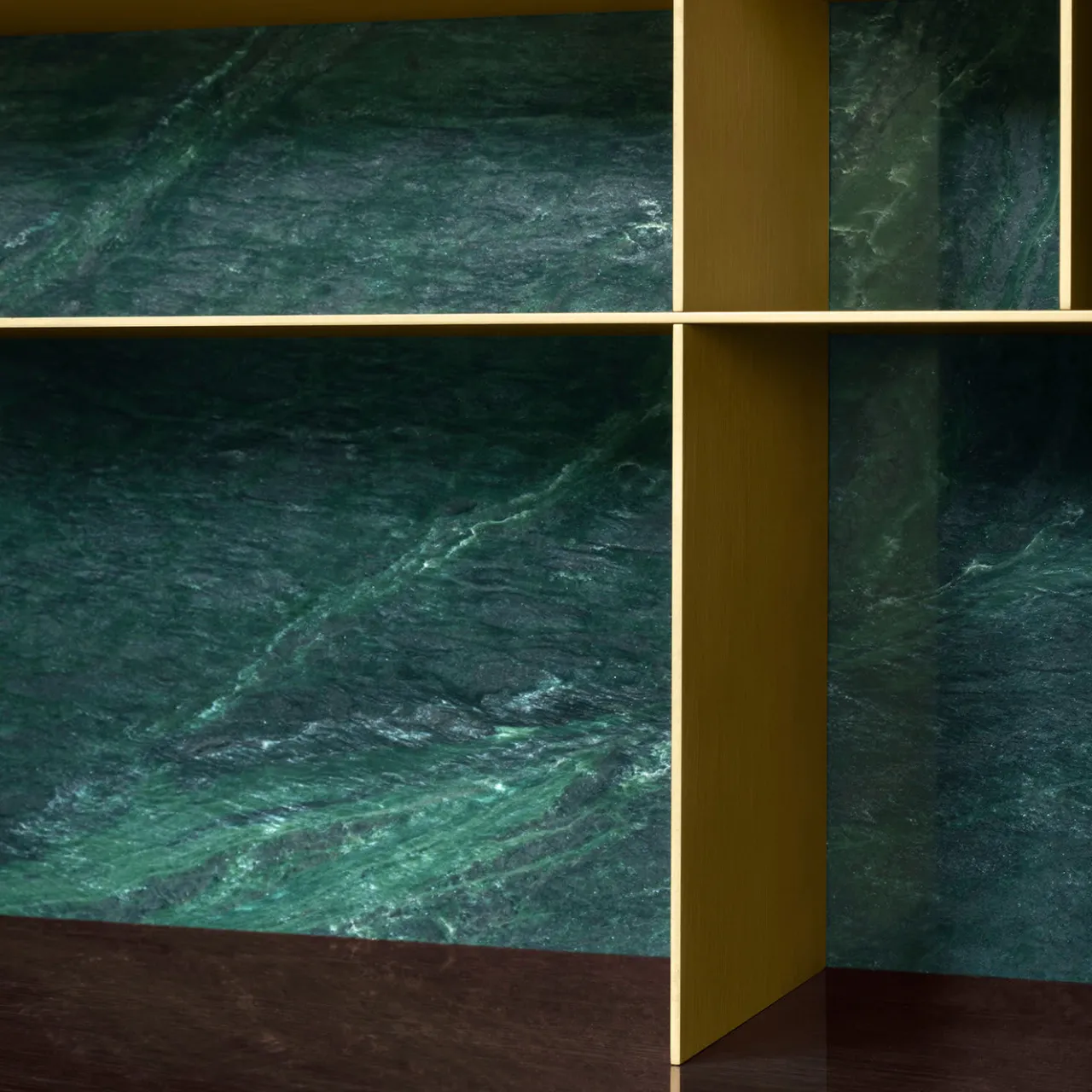 Superlativa vetrina di artigianato, questo mobile può essere utilizzato come mobile bar, scrigno per gioielli o wunderkabinett per esporre eleganti e preziosi pezzi d’accento. Di ispirazione giapponese, il mobile poggia su gambe in ottone con finitura satinata ed è realizzato in pregiato legno di mogano abbinato a marmo verde Alpi, per un gioco ipnotico di tinte, venature e texture. Il mobile presenta due scomparti chiusi e una piccola serie di ripiani aperti.