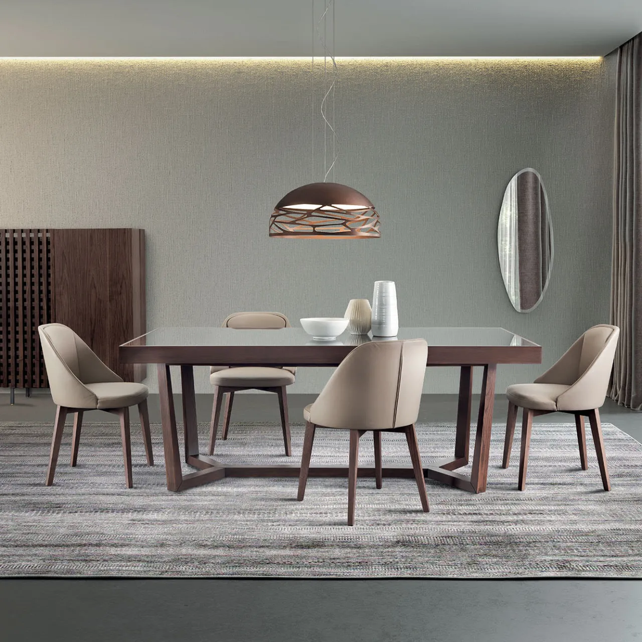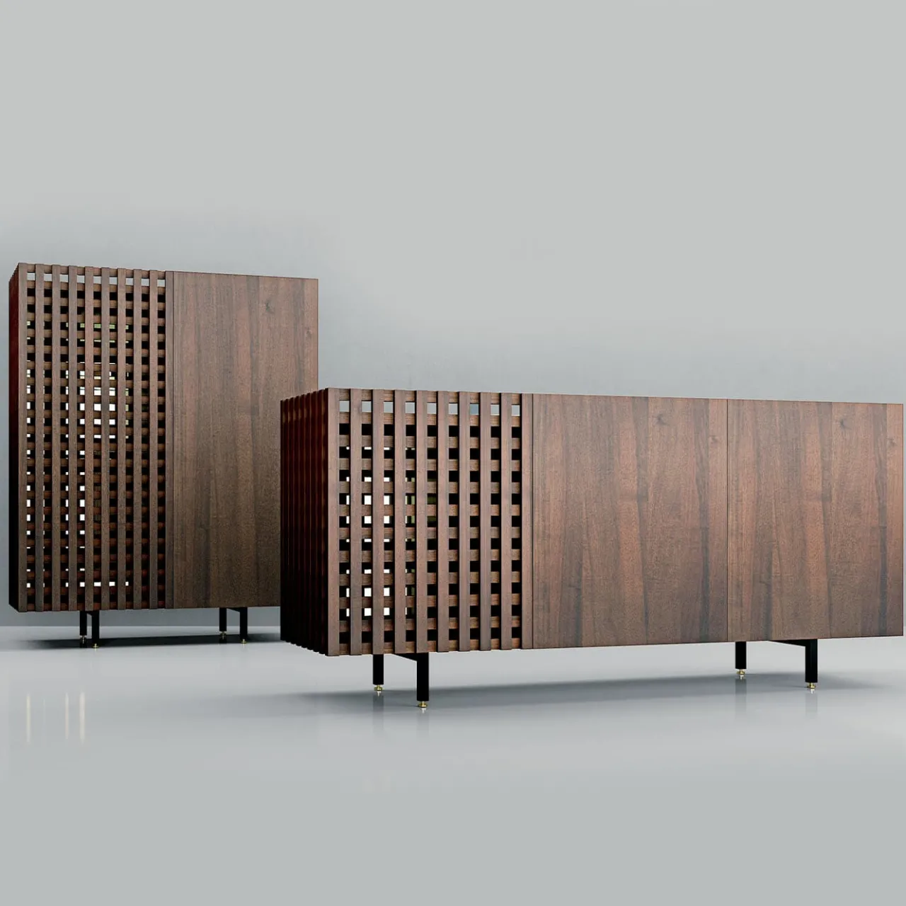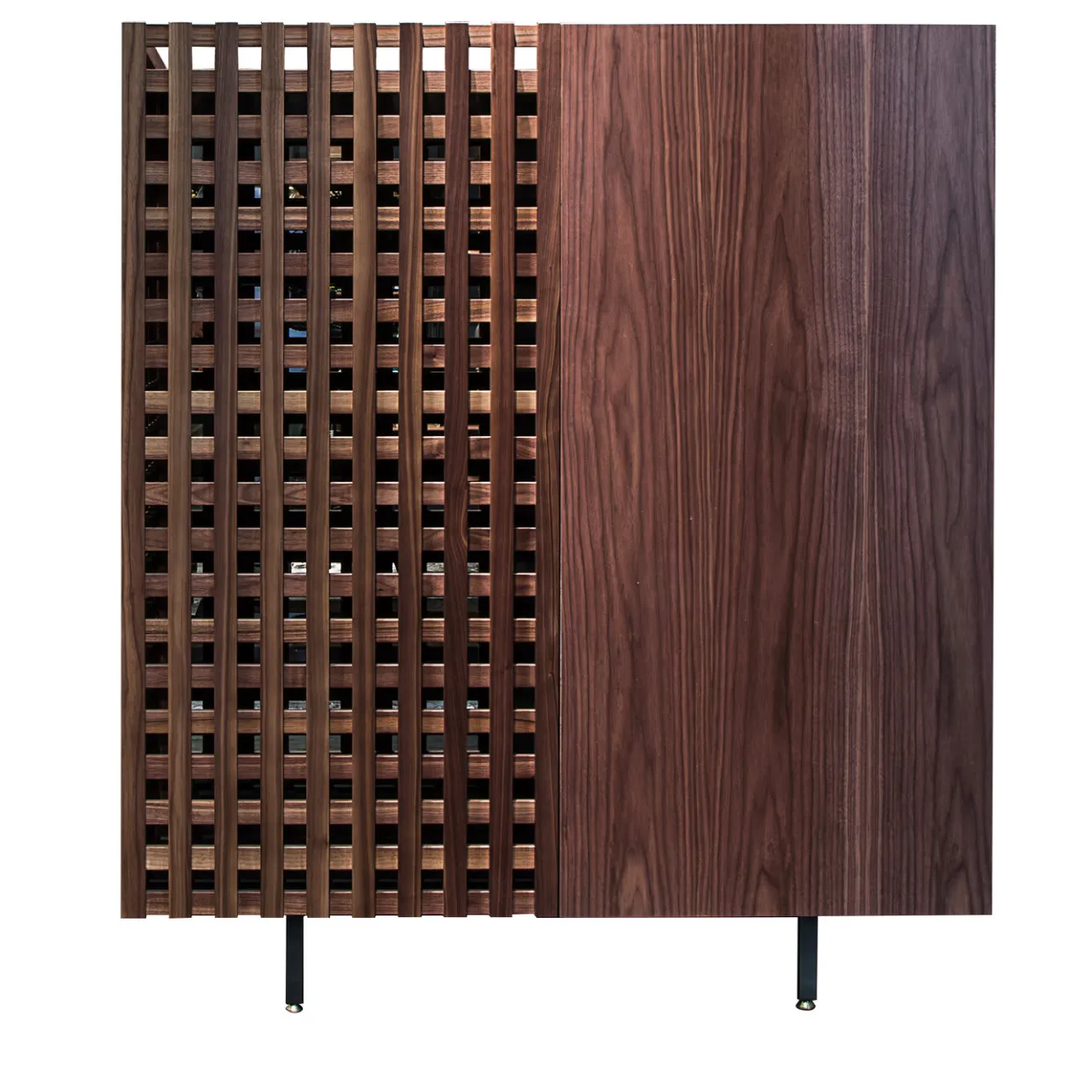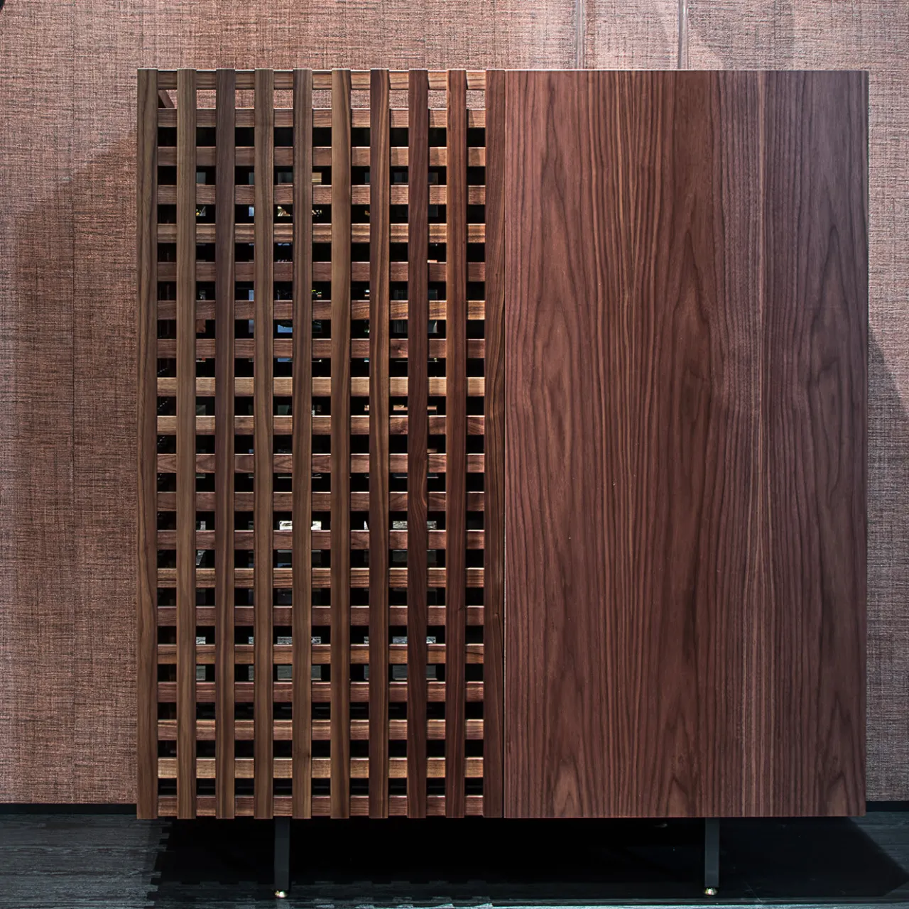 Un mobile che si ispira alla mashrabiya, un elemento architettonico che caratterizza le residenze arabe, un tipo di finestra a bovindo sporgente. Un aspetto importante della cultura araba e islamica è la privacy. È strutturato in MDF laccato opaco, con ante impiallacciate e in massello di noce canaletto, con base in metallo verniciato, piano interno laccato e schienale a specchio, portabottiglie.