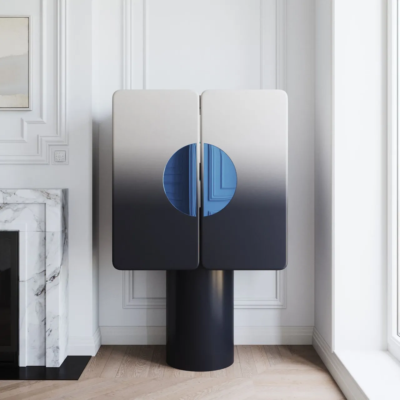 Una soluzione contenitiva concepita per stupire con il suo sofisticato impatto decorativo, questo mobile bar è un esercizio di pulizia delle linee ammorbidito da curve sottili. Un’audace gamba cilindrica in metallo sostiene l’intero mobile contenitore, dove il nero sfuma gradualmente in sfumature di grigio e beige caldo, interrotte solo da inserti di specchio blu demi-lune. Illuminato da un elegante sistema di illuminazione a LED, l’interno è dotato di un cassetto, uno specchio, ripiani in vetro e tasche laterali.