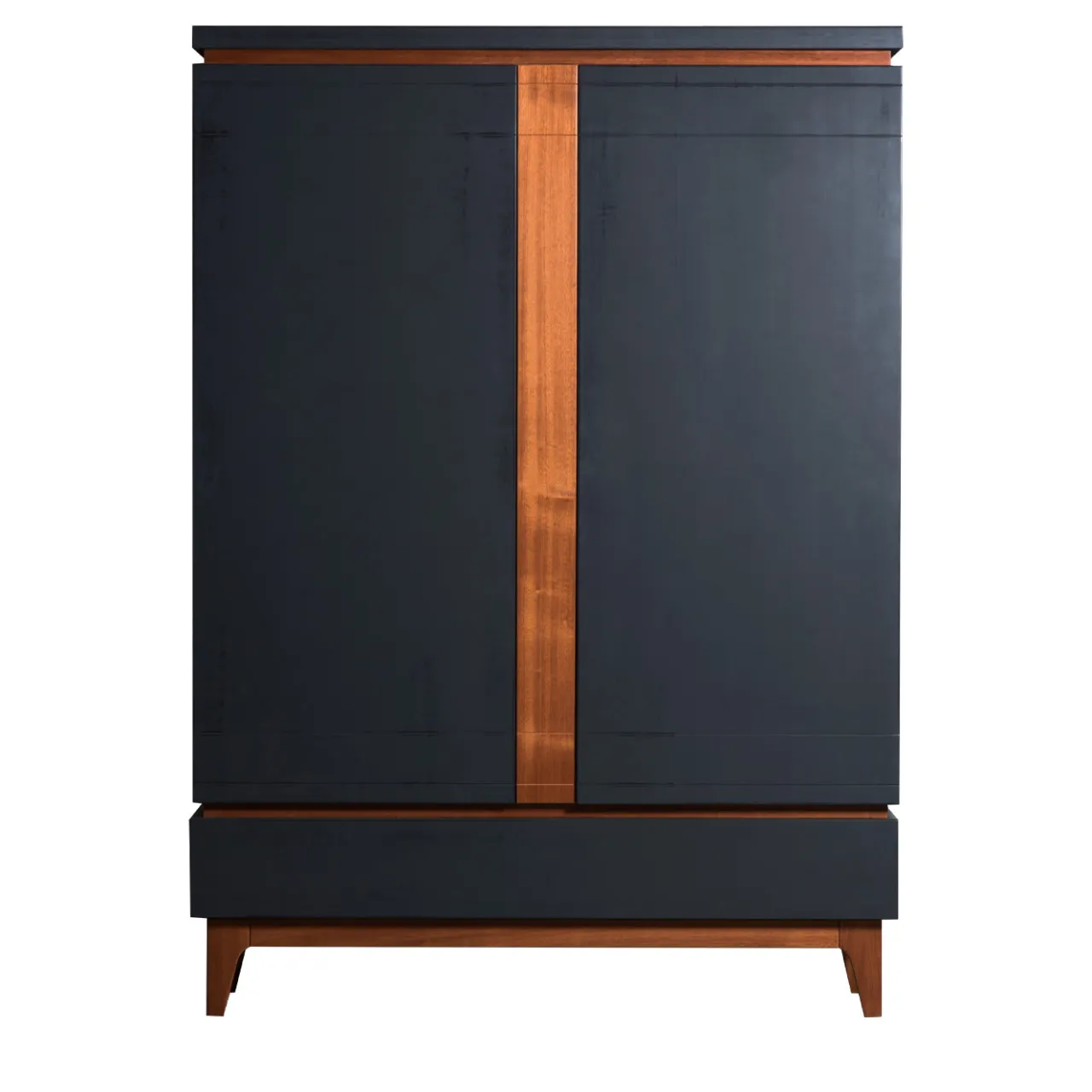 Questo armadio estremamente elegante e sofisticato è realizzato in legno di mogano Sipo. Le due ante anteriori e il cassetto sono verniciati in blu piombo, che offre un interessante contrasto con le finiture in legno naturale. L’interno è illuminato da una luce a LED. Il marchio è stato fondato nel 1898 e si dedica a portare il meglio dell’arredamento Made in Italy nel mondo.