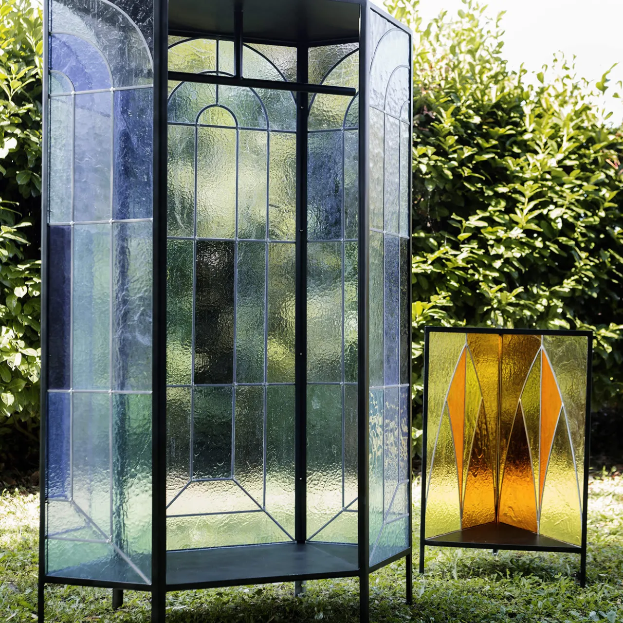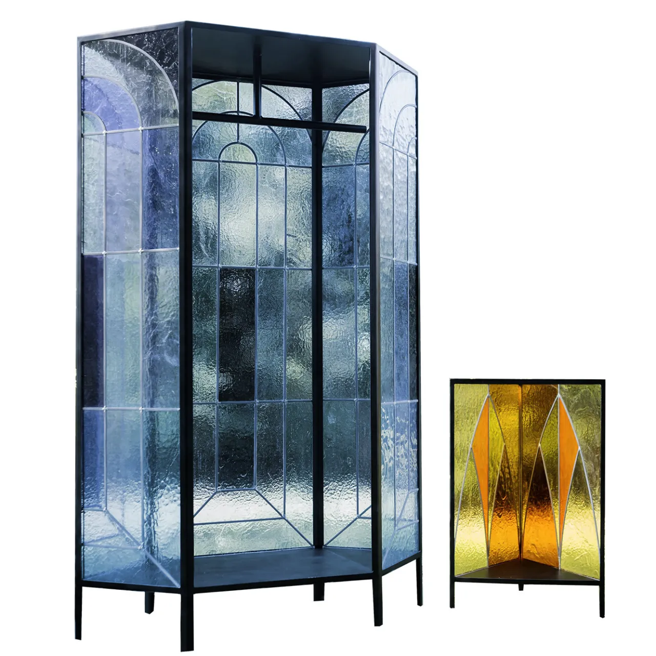 Ispirato al fascino suggestivo e traslucido delle finestre di una chiesa, questo mobile esagonale è un oggetto di design unico nel suo genere. Montato su una struttura in ferro, le ante in vetro del mobile sono dipinte in un’affascinante tavolozza blu che esalta la combinazione di tradizione e innovazione.