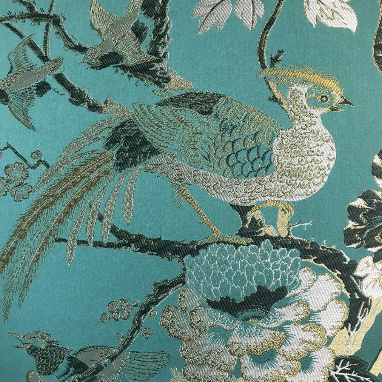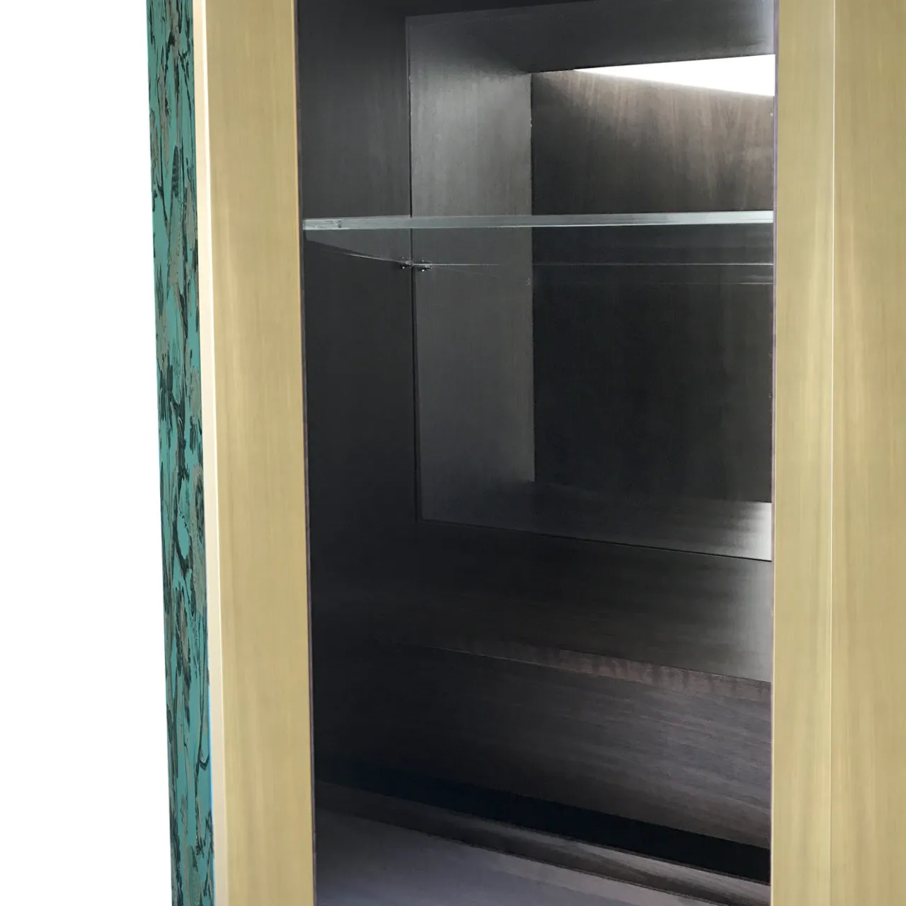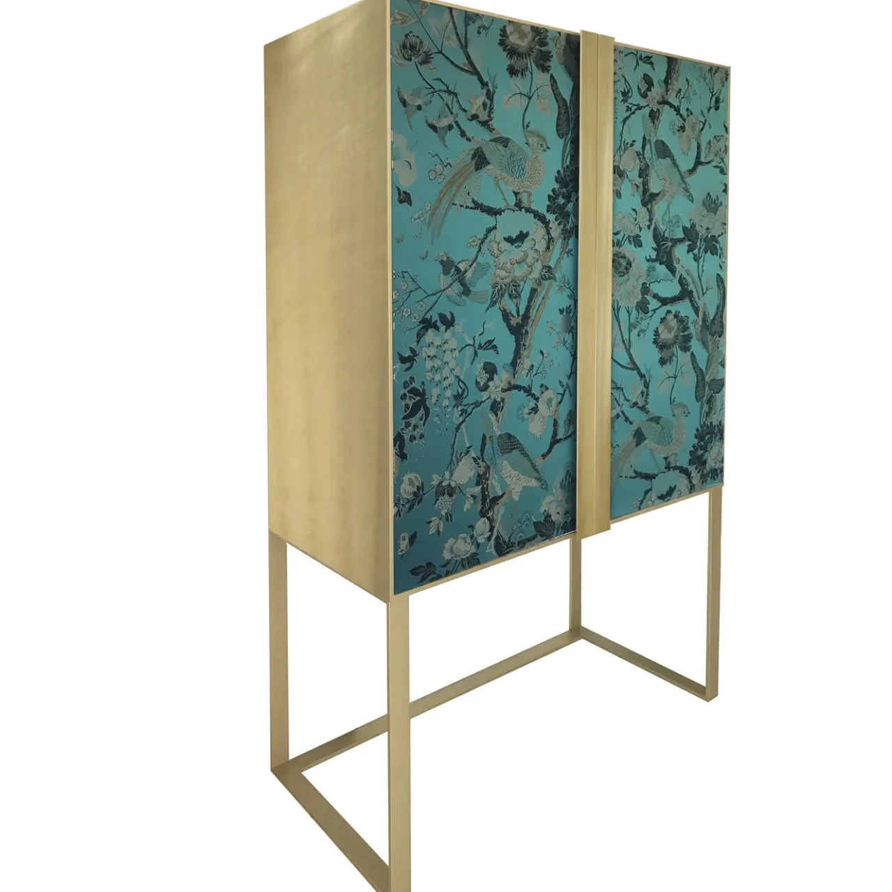 Questo raffinato mobile completerà qualsiasi arredamento, grazie alla sua silhouette minimalista e ai materiali nobili utilizzati. Il suo fascino senza tempo è dato dalla struttura e dalle maniglie in ottone spazzolato che incorniciano elegantemente le ante del mobile in legno interamente rivestite con un prezioso tessuto jacquard di seta in verde ornato da una decorazione di uccelli e rami in oro, argento e nero. L’interno presenta due cassetti in legno di noce opaco e un ripiano in vetro extrachiaro, oltre a uno specchio posteriore che amplia lo spazio e conferisce un riflesso suggestivo al pezzo.