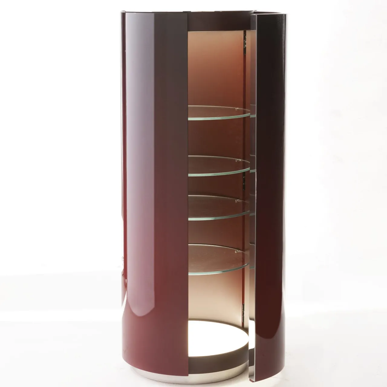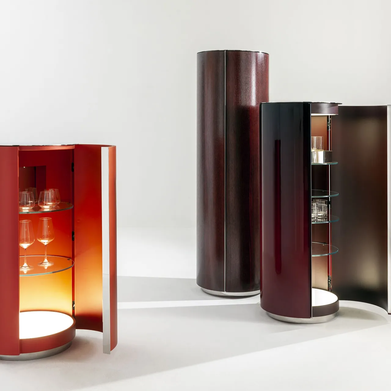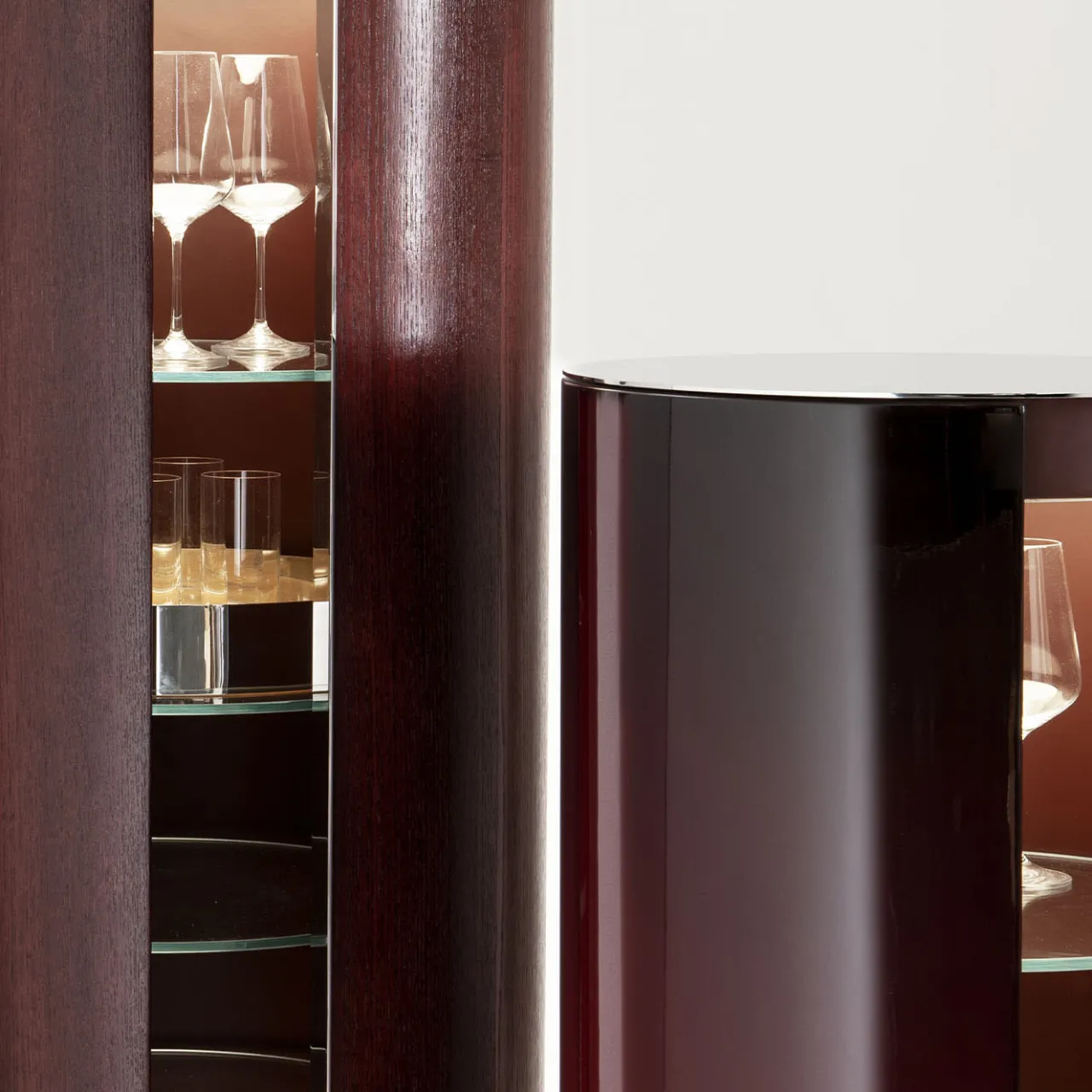 Una sofisticata finitura lucida e sfumata rivela il fascino elegante di questo mobile cilindrico in frassino. Cinque ripiani in vetro ultraleggero offrono molto spazio all’interno del mobile laccato opaco, illuminato da un sistema di illuminazione a LED e chiuso da un’anta a battente. Il piano in acciaio inox, la maniglia e la base a zoccolo completano il pezzo. Contattate il Concierge per conoscere le diverse dimensioni e le opzioni di personalizzazione.