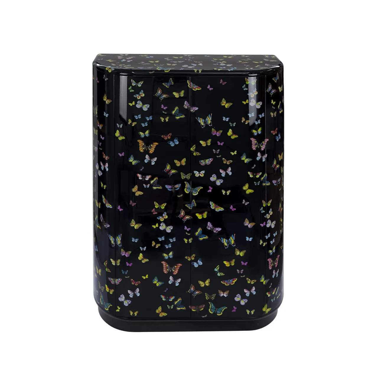 Il mobile curvo Fornasetti è un mobile contenitore in legno serigrafato, dipinto e laccato a mano secondo il metodo tradizionale dell’Atelier. Il motivo è caratterizzato dalle iconiche farfalle colorate di Fornasetti su un elegante sfondo nero. Ogni mobile in legno Fornasetti è un pezzo unico ed eventuali piccole discrepanze tra creazioni simili sono il risultato della lavorazione artigianale.