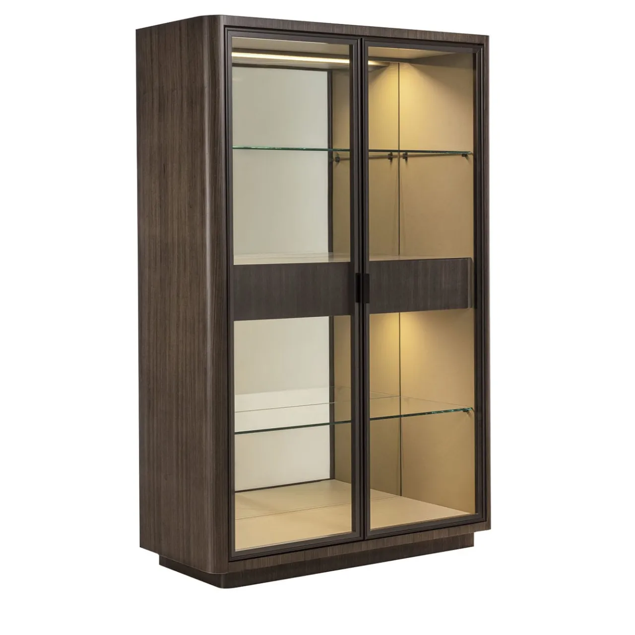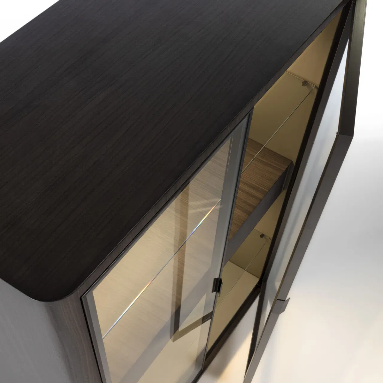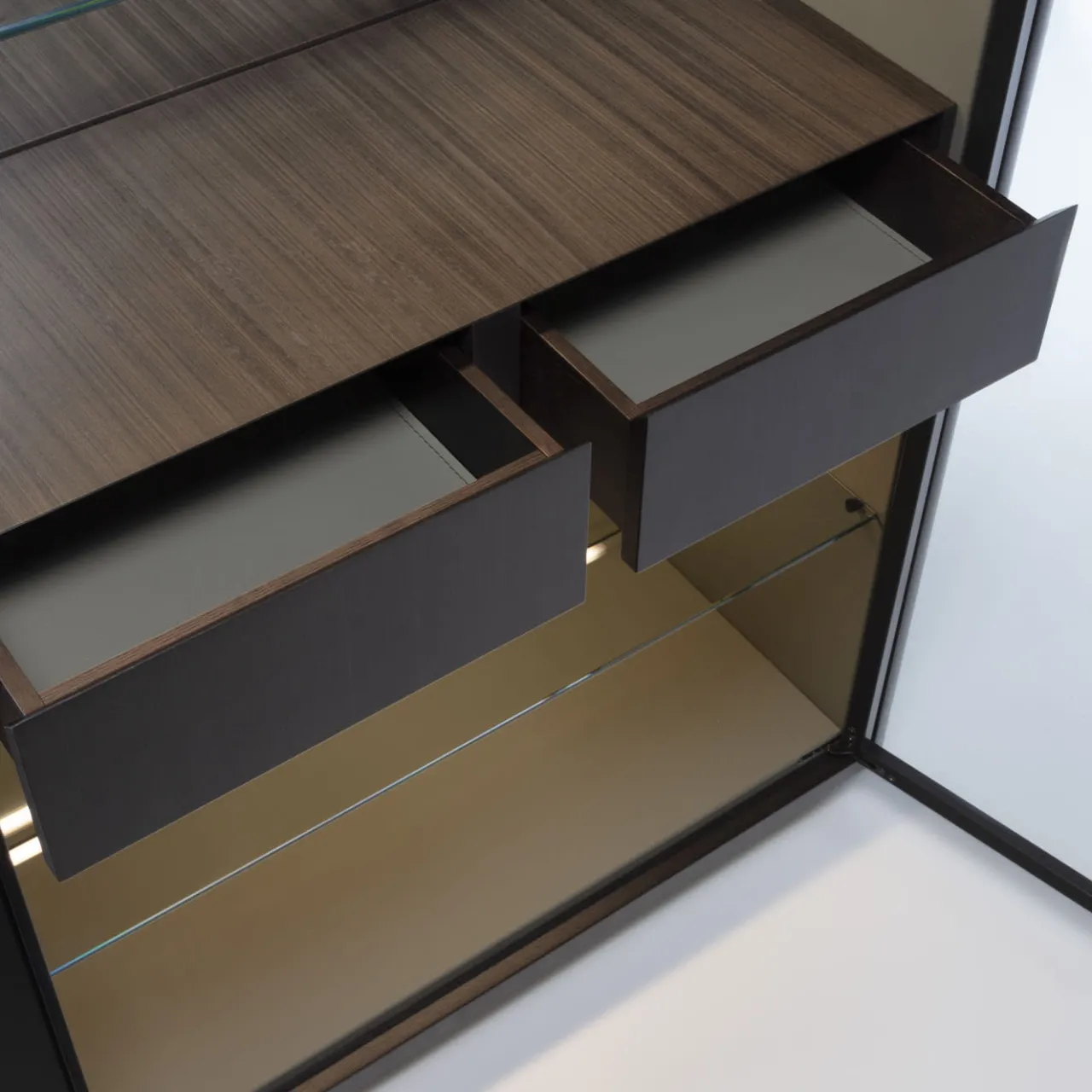 Mobile in vetro dall’elegante design lineare. La struttura esterna è impreziosita dal rivestimento in Tay scuro e dal dettaglio degli angoli arrotondati. L’interno è caratterizzato dalla qualità dei dettagli, cassetti interni in Tay scuro, struttura interna rivestita in pelle, pannello posteriore a specchio e ante con profilo in alluminio. Su richiesta, questo mobile è disponibile anche con un sistema di illuminazione interna.