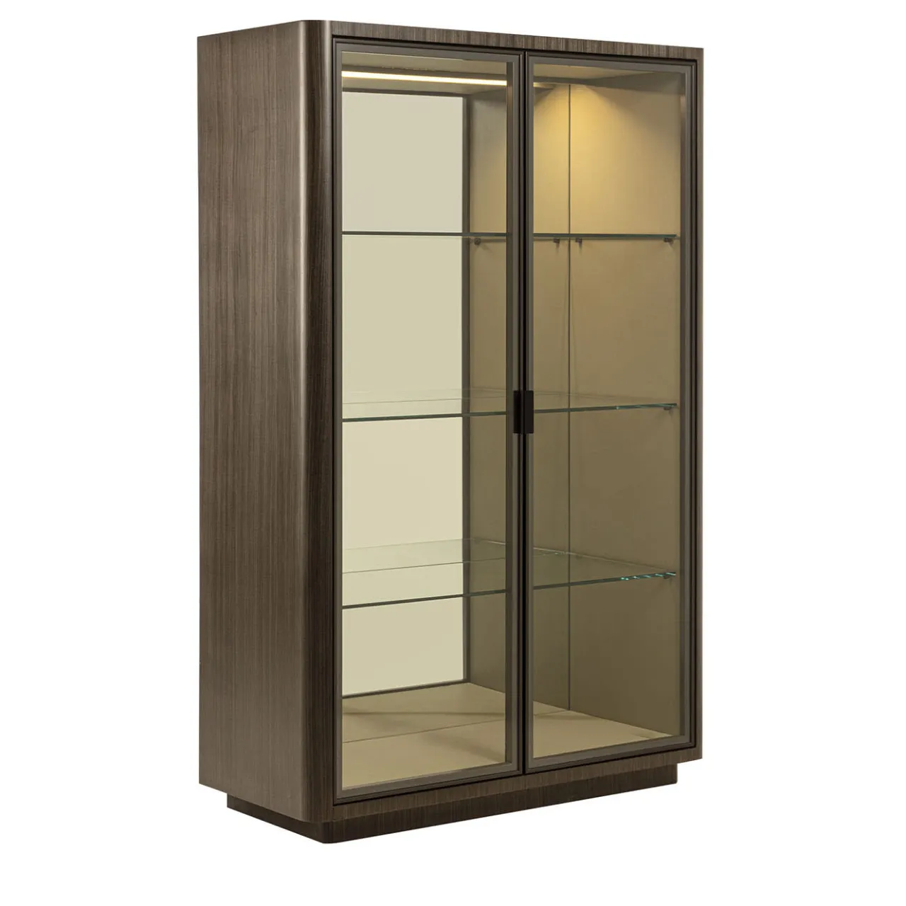 Mobile in vetro dall’elegante design lineare. La struttura esterna è impreziosita dal rivestimento in Tay scuro e dal dettaglio degli angoli arrotondati. L’interno è caratterizzato dalla qualità dei dettagli, dalla struttura interna rivestita in pelle, dal pannello posteriore a specchio e dalle ante con profilo in alluminio. Su richiesta, questo mobile è disponibile anche con un sistema di illuminazione interna.