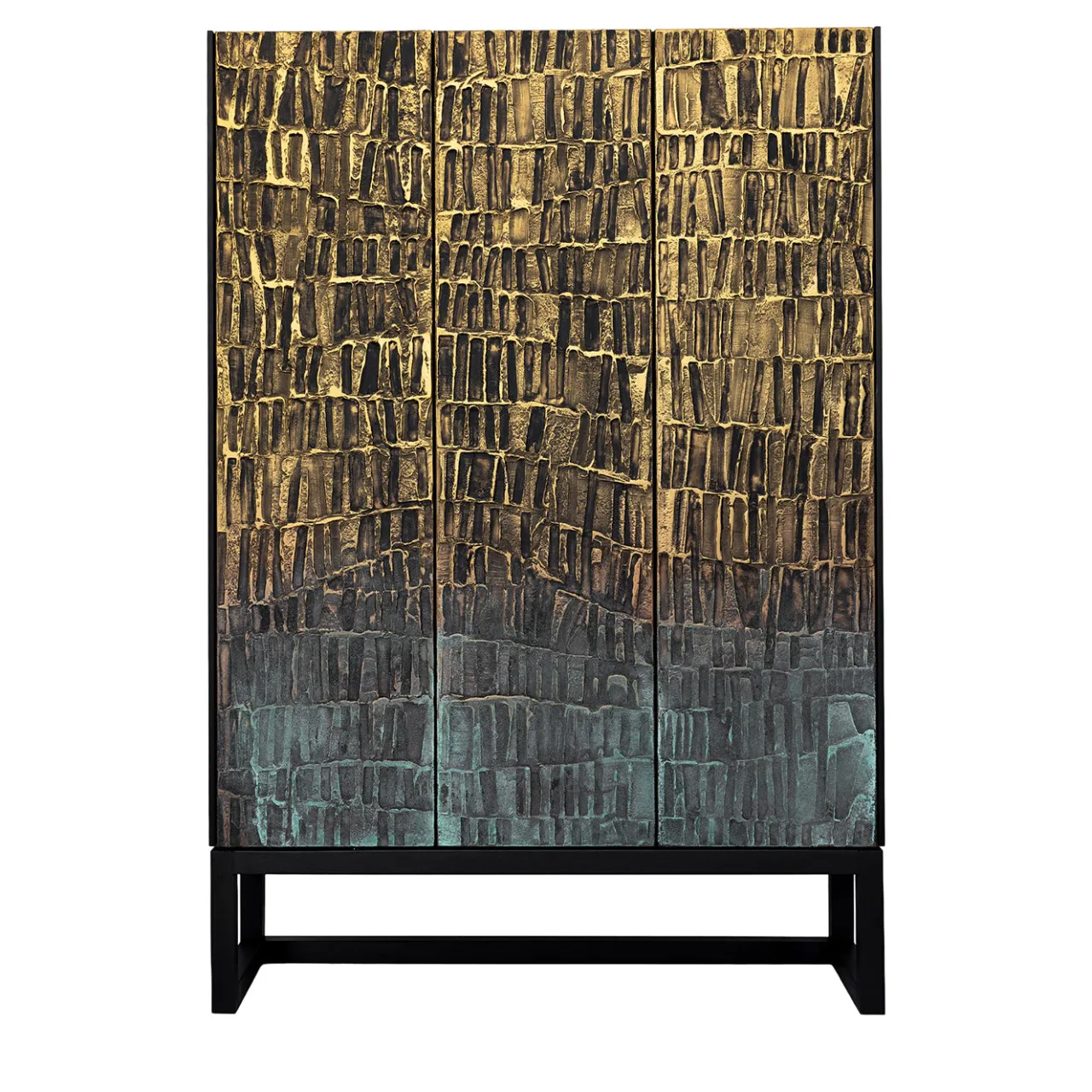 Armadio a tre porte con una facciata testurizzata con finiture in oro e nero patinato, dando vita a una superficie dinamica e tattile che ricorda un dipinto astratto. Il pezzo è interamente costruito in legno tinto di nero e poggia su una solida base. Le dimensioni personalizzabili consentono l’adattamento a vari spazi interni, unendo estetica artistica e praticità contenitiva. Per ulteriori informazioni, contattare il Concierge.