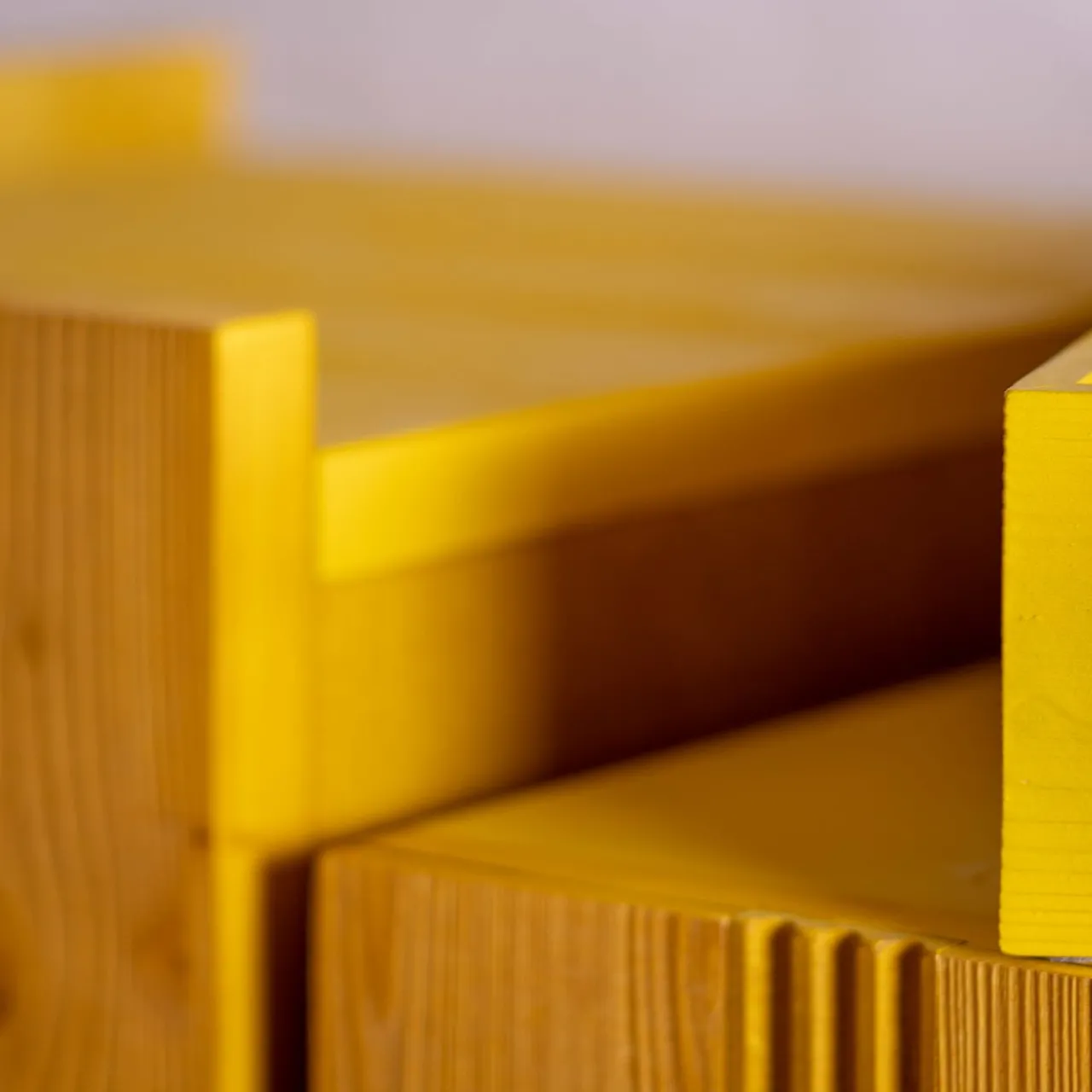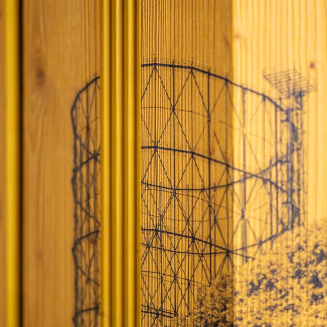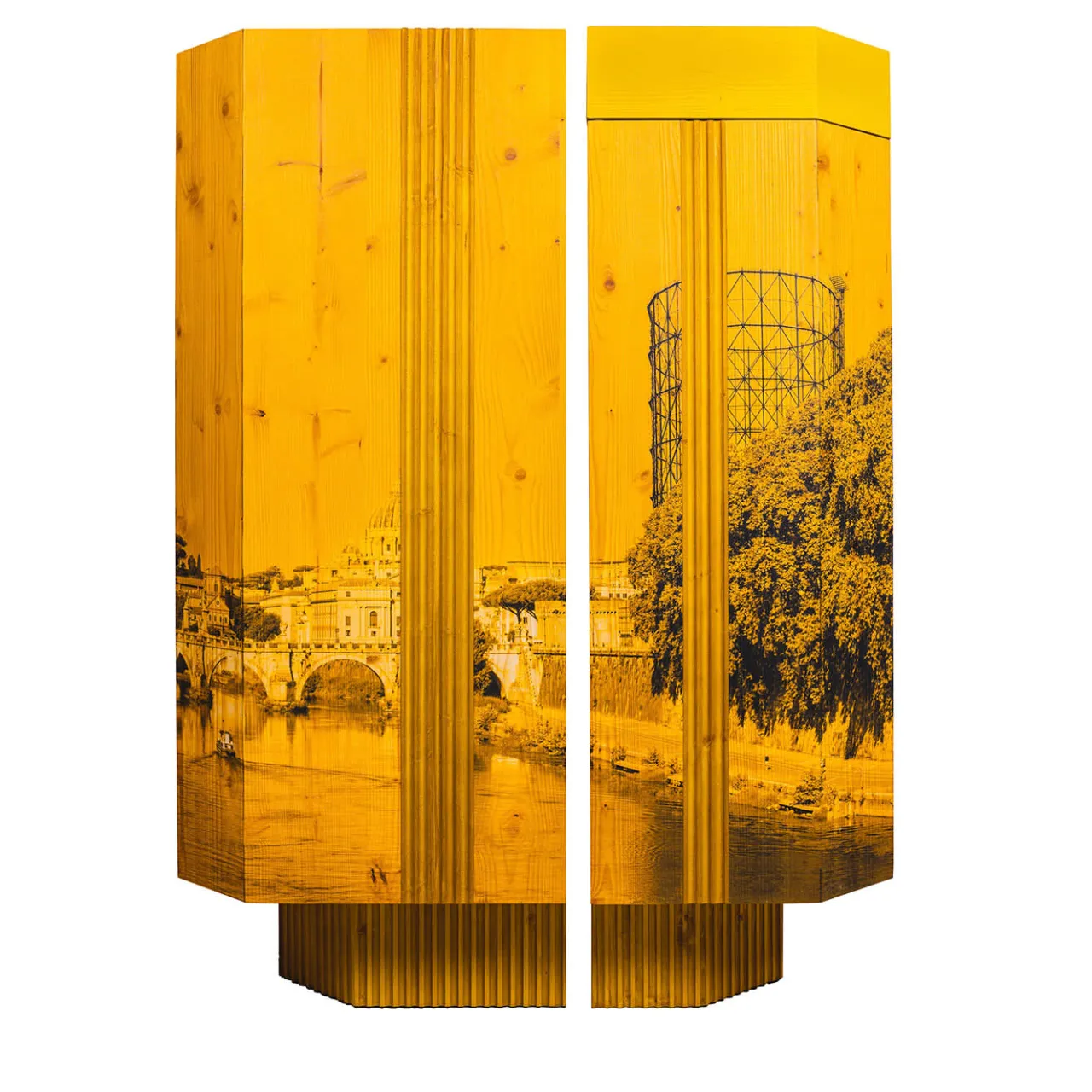 Una rielaborazione dei mobili bar degli anni ’50 con un nuovo aspetto mozzafiato. La vista urbana è suddivisa in due moduli separati ma complementari, destinati a contenere rispettivamente le bottiglie e i bicchieri. Ogni contenitore è composto da una cassa in legno massiccio con un’unica anta sagomata. Il vano interno è rivestito di specchi, mentre la parte superiore di uno dei moduli si trasforma in un vassoio mobile.
