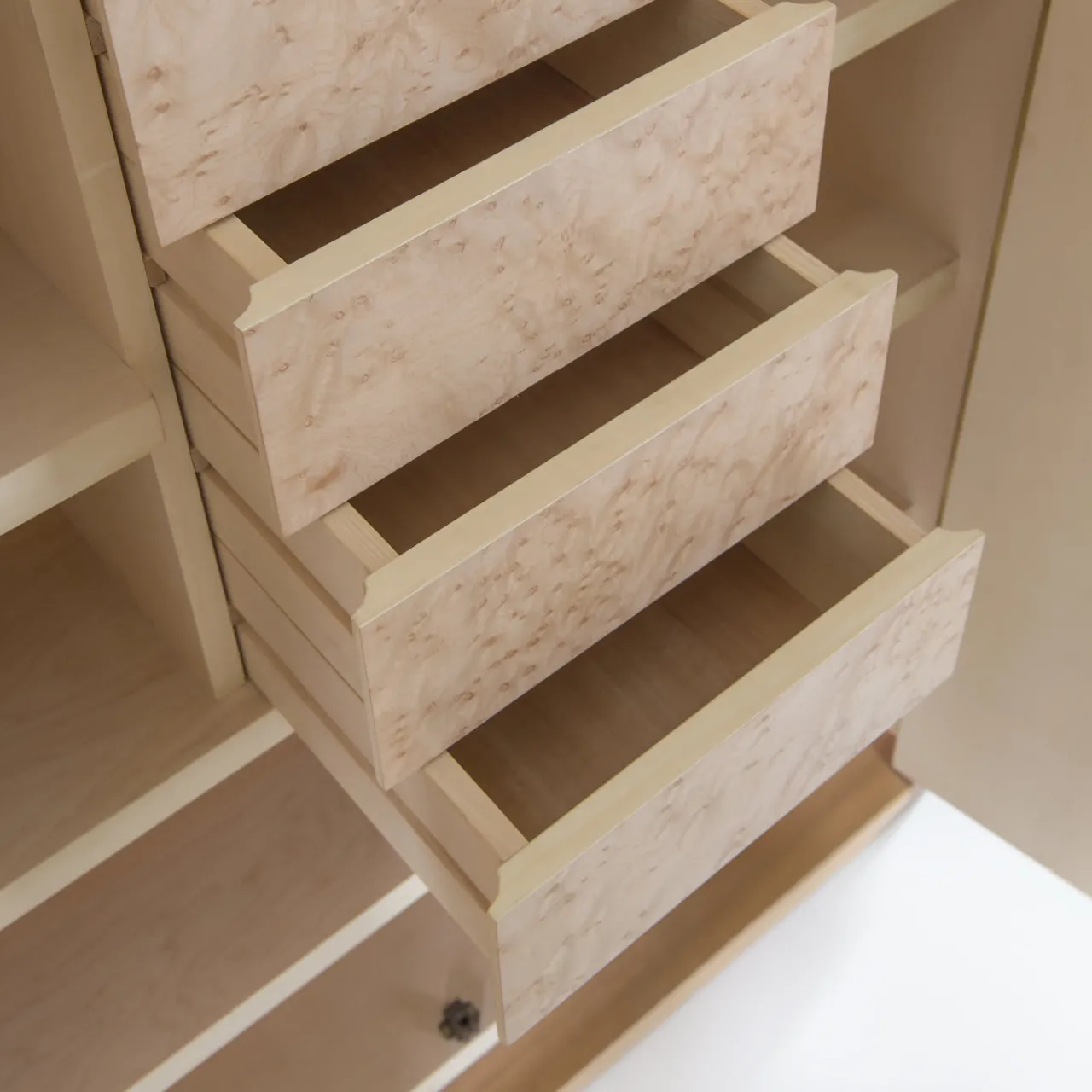 Questo guardaroba è in grado di offrire un’ottima sistemazione per gli oggetti più preziosi. La base è in legno di noce e la struttura esterna è realizzata in sezioni con sezioni impiallacciate in noce sui due lati e rivestimento in pergamena sulle ante frontali. L’interno è completo di ripiani in legno di acero e quattro cassetti interni con frontali in radica di acero e maniglie in ebano massiccio. L’arredamento di qualsiasi camera da letto o cabina armadio sarà immediatamente valorizzato dall’aggiunta di questo pezzo. Disegnato da Antonio Berdondini, anno 1941.