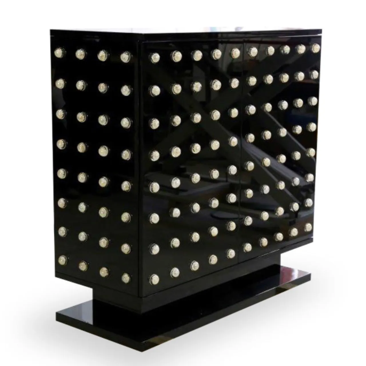 L’aspetto straordinario di questo superbo mobile in legno si ottiene aggiungendo alle due ante frontali laccate nere 144 elementi in vetro semisferico. Aggiungendo alla rigorosa decorazione una qualità eterea, questo sorprendente oggetto d’arredo funzionale sarà il punto focale di un soggiorno o di una sala da pranzo, fornendo al contempo un prezioso e versatile spazio di archiviazione, con il suo interno diviso da due ripiani anch’essi in finitura laccata lucida. L’elegante base a zoccolo completa questo design unico.