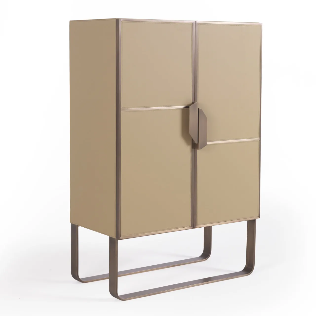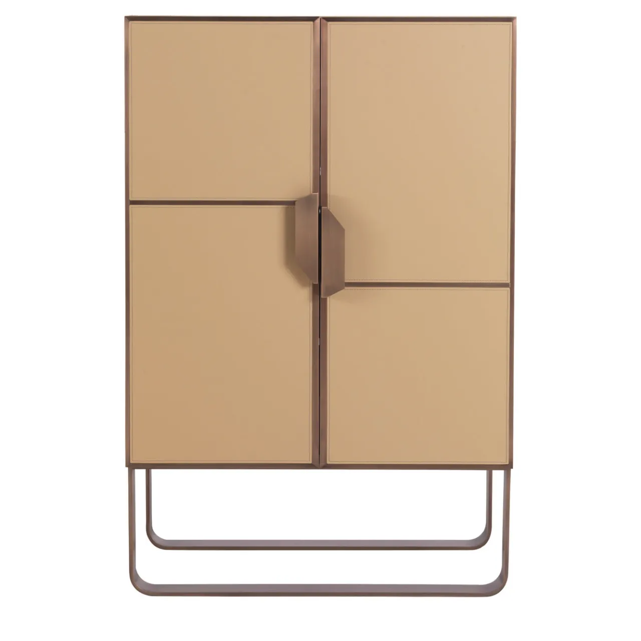 Accento di raffinatezza per qualsiasi arredamento moderno o classico, questo splendido mobile bar presenta un design semplice arricchito da materiali raffinati. I pannelli delle ante sono interamente rivestiti in morbida pelle beige con dettagli in metallo spazzolato che richiamano la finitura delle due gambe a U e delle maniglie. Si prega di consultare il Concierge per avere dettagli precisi sugli interni e sui materiali.