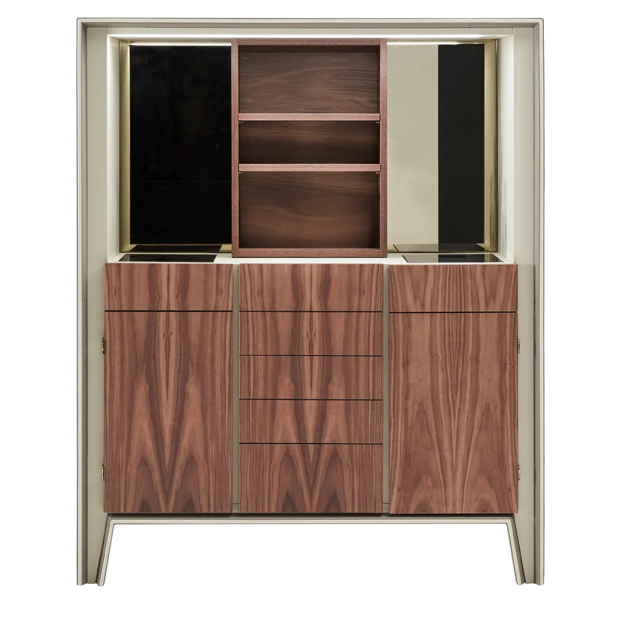 Un gioiello dell’ebanisteria che si distingue per i suoi contrasti, questo armadio soddisfa molteplici esigenze di contenimento e al tempo stesso fa una dichiarazione di seducente lusso sartoriale. Il suo nome – che in italiano significa darsena – ha ispirato il suo design multifunzionale e versatile, legato alle esigenti necessità di organizzazione dello spazio tipiche delle imbarcazioni. Combinando la pregiata pelle beige con l’ecopelle per l’unità centrale, sfoggia anche motivi di venature del legno ininterrotte, esaltate dal sistema di illuminazione a LED incorporato.