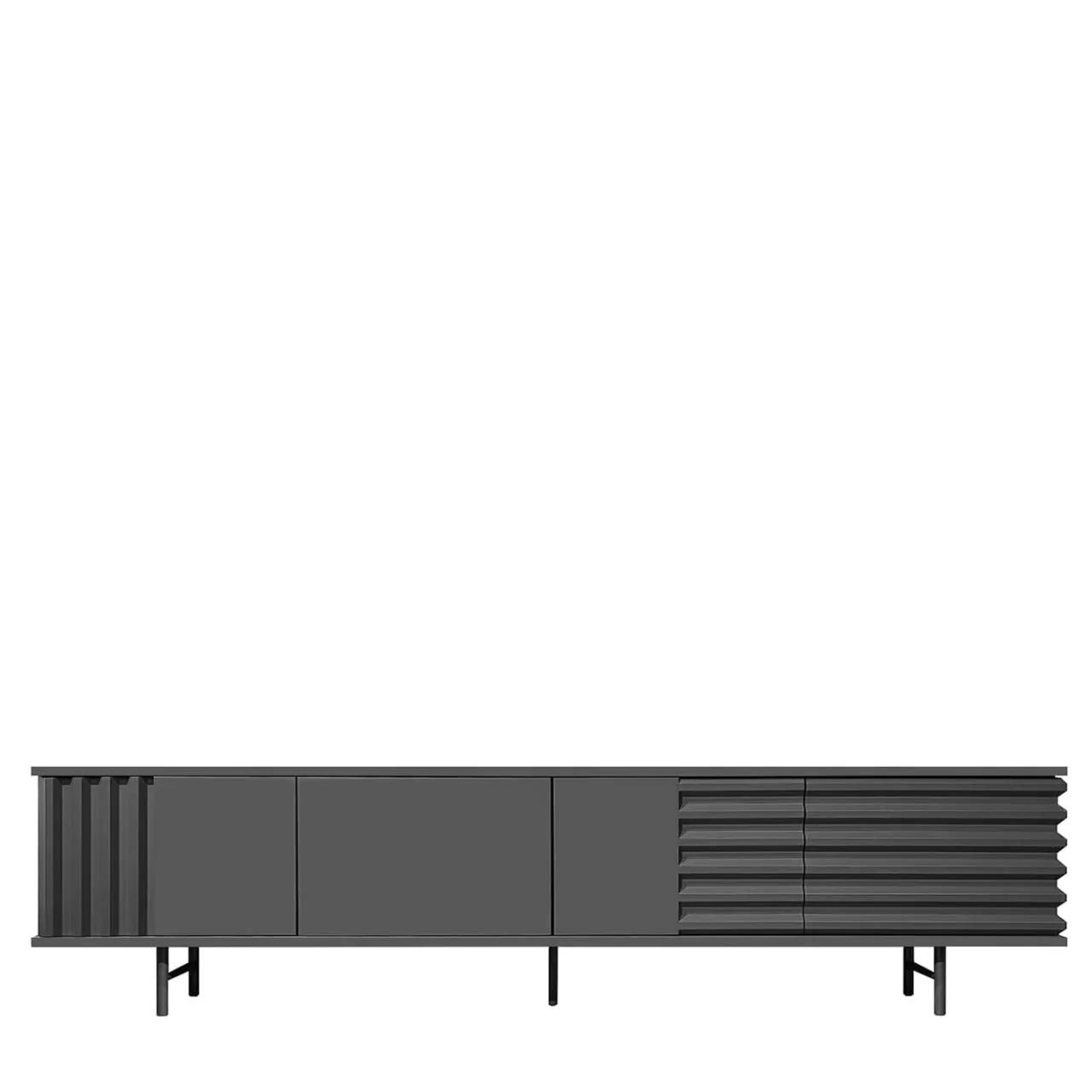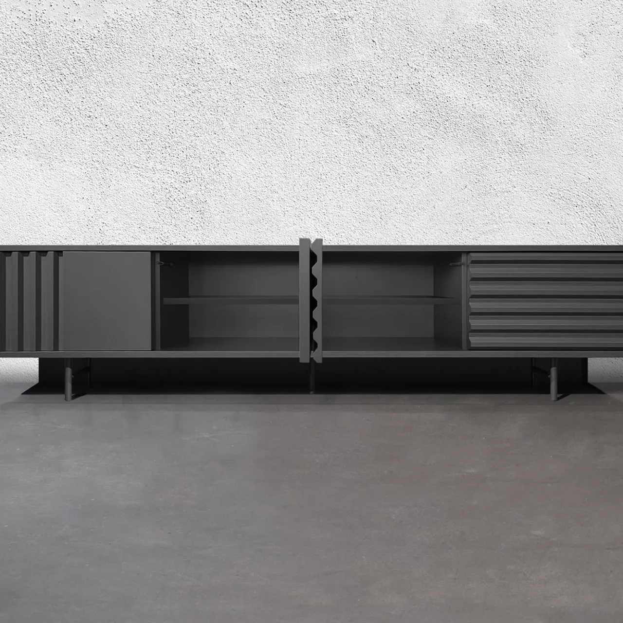 La credenza B-SIDE in grigio ardesia offre un’elegante combinazione di ispirazione industriale e design funzionale. Con una dimensione di 240 cm, le sue quattro ante push-pull presentano pannelli scanalati che evocano profondità e movimento. Realizzata in MDF laccato e con gambe in acciaio, questa credenza combina durata ed estetica contemporanea. Le finiture eco-compatibili e gli interni personalizzabili, disponibili in 12 colori, lo rendono una scelta versatile per le case moderne che cercano stile e utilità.