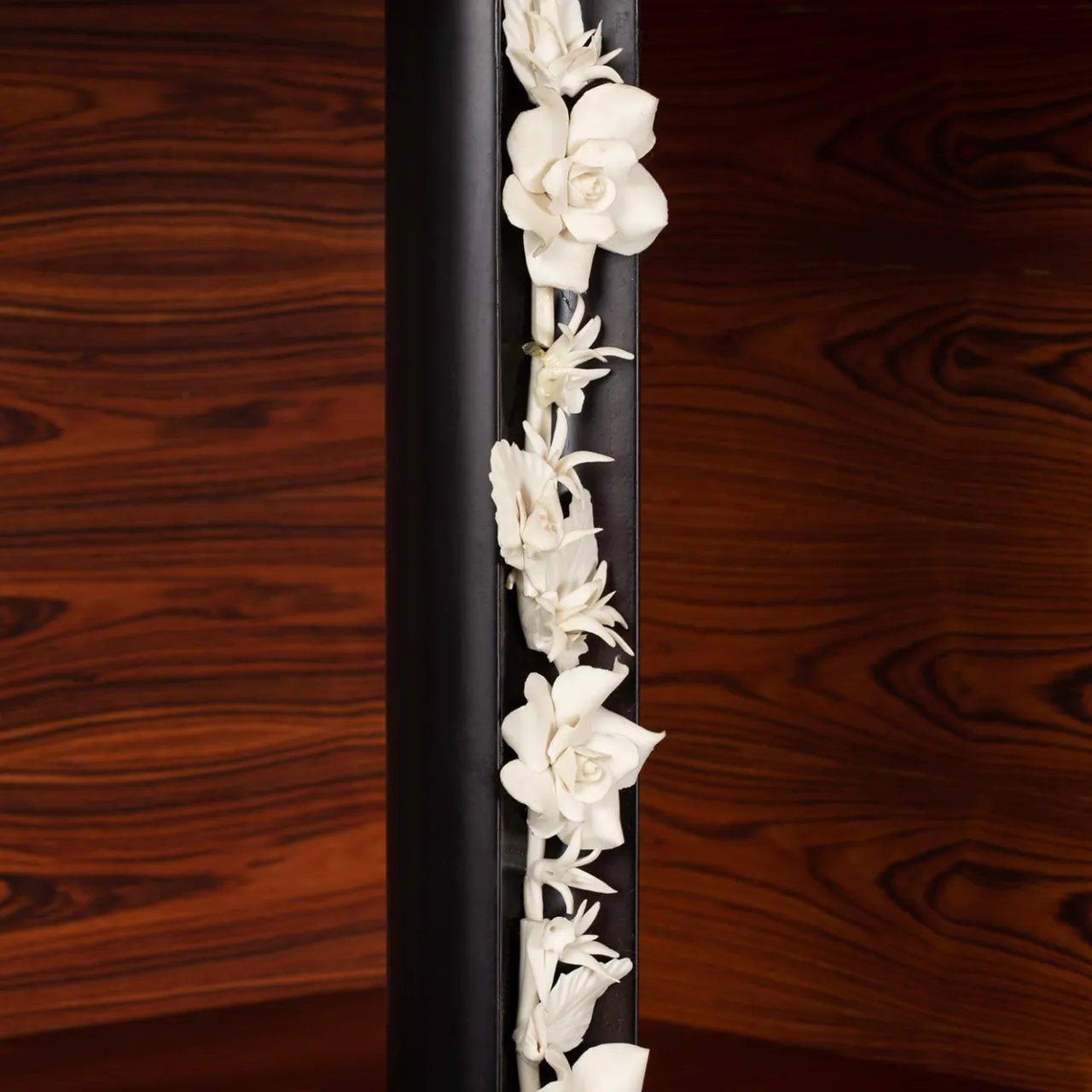 Eden rappresenta il rapporto tra razionalità e istinto all’interno di noi stessi. Quando l’istinto prende il sopravvento, emerge la parte più selvaggia della nostra natura, rappresentata dai fiori di porcellana che demoliscono le fondamenta del mobile, conferendo a questo mobile un’allure apparentemente instabile ed eterea. Ma sono proprio la nostra natura e i nostri valori a riportarci alla razionalità e a ripristinare l’equilibrio delle forme. Mobile bar in legno di violetta con dettagli in porcellana di Capodimonte.