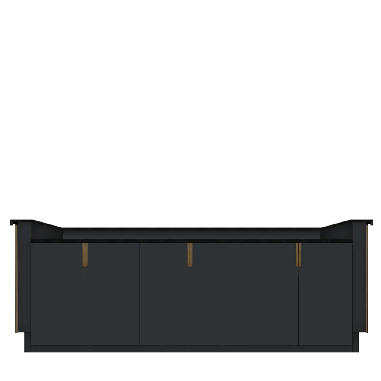 Questo banco bar è un elemento decorativo per le aree bar di residenze private, club house e spazi commerciali esclusivi. Nella parte anteriore, 5 pannelli color verde acqua decorati a mano con foglia d’oro e incorniciati da un bordo in ottone bronzato attirano l’attenzione sul bancone bar di primo piano. Il resto della struttura è laccato in finitura grigio-nero opaco con un piano in marmo nero assoluto spazzolato e maniglie in ottone bronzato sul retro.