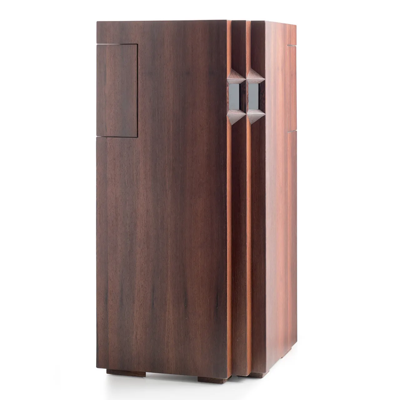 Questo elegante baule in legno di wenghe liscio presenta quattro porte e due finestre che si aprono a doppio pannello, oscillando orizzontalmente e dando al pezzo una forma interessante quando viene utilizzato.