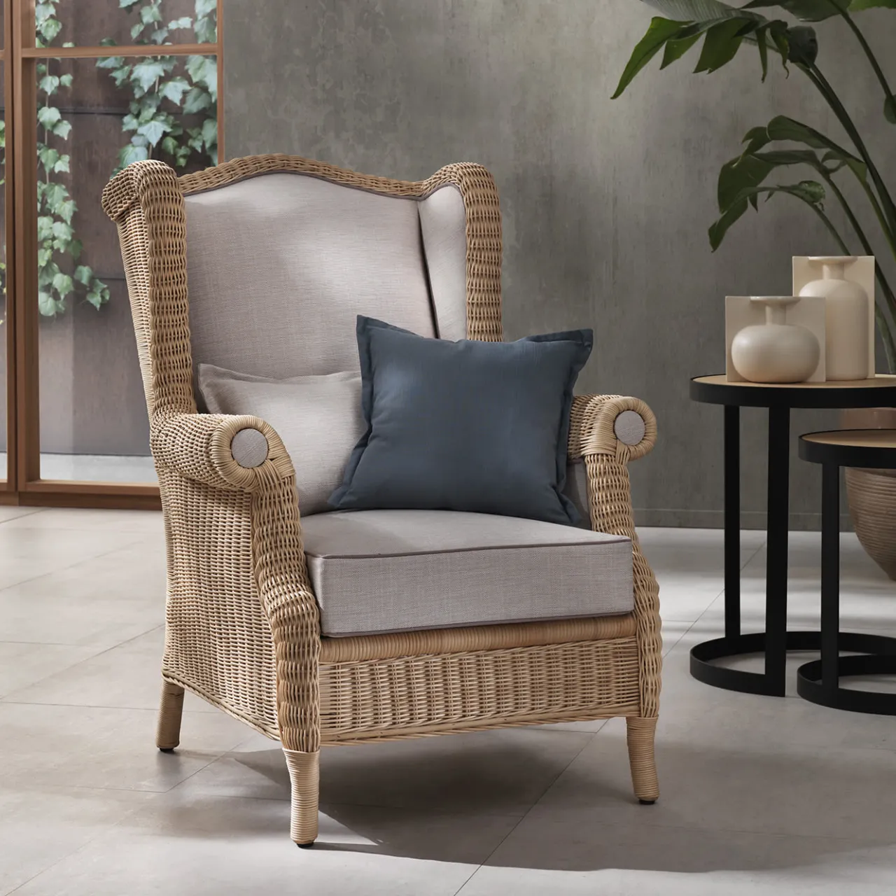 Le intriganti curve che tradizionalmente ricalcano la silhouette di un bergére delineano anche questa preziosa poltrona, capolavoro di intreccio manuale. L’interno è rivestito di fresco lino beige e il cuscino è sfoderabile per garantire la massima igiene e praticità. Ottimo complemento per arredamenti rustico-chic, è sottoposto a un trattamento protettivo a base d’acqua.