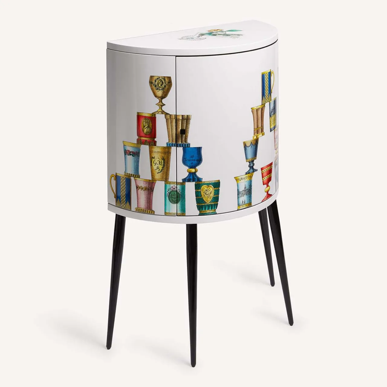 Decorata con disegni di bicchieri di cristallo di Boemia, questa consolle illumina qualsiasi spazio con la sua presenza colorata. Serigrafata, dipinta e laccata a mano, è dotata di un’anta a battente e di un ripiano estraibile. Eventuali piccole discrepanze tra creazioni simili sono il risultato della lavorazione artigianale e attestano l’unicità di ogni prodotto.