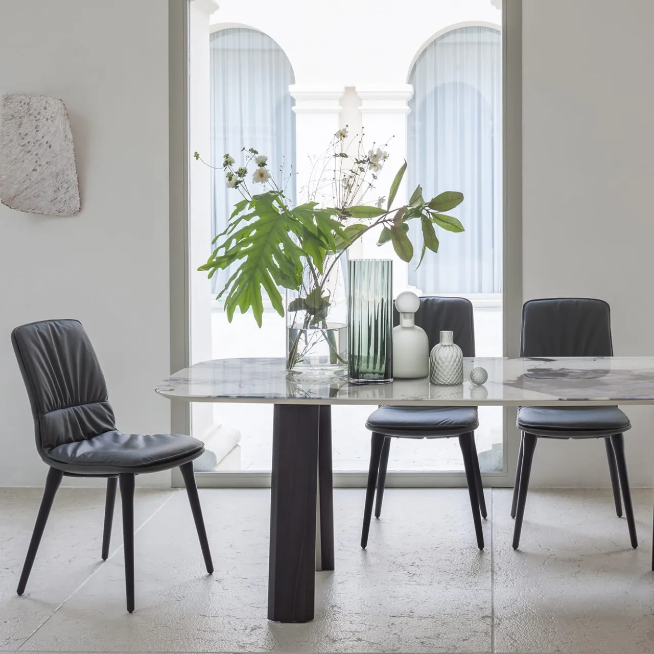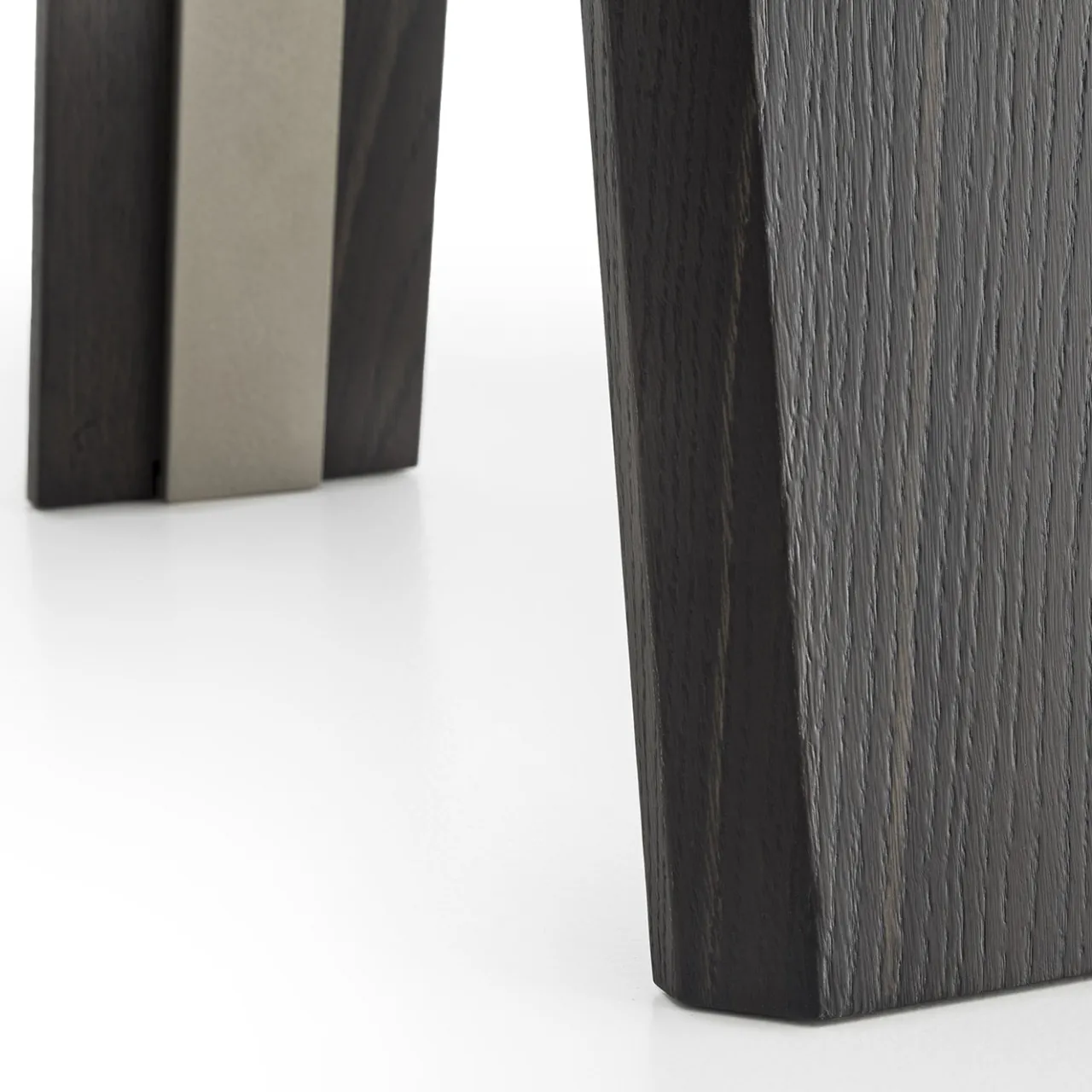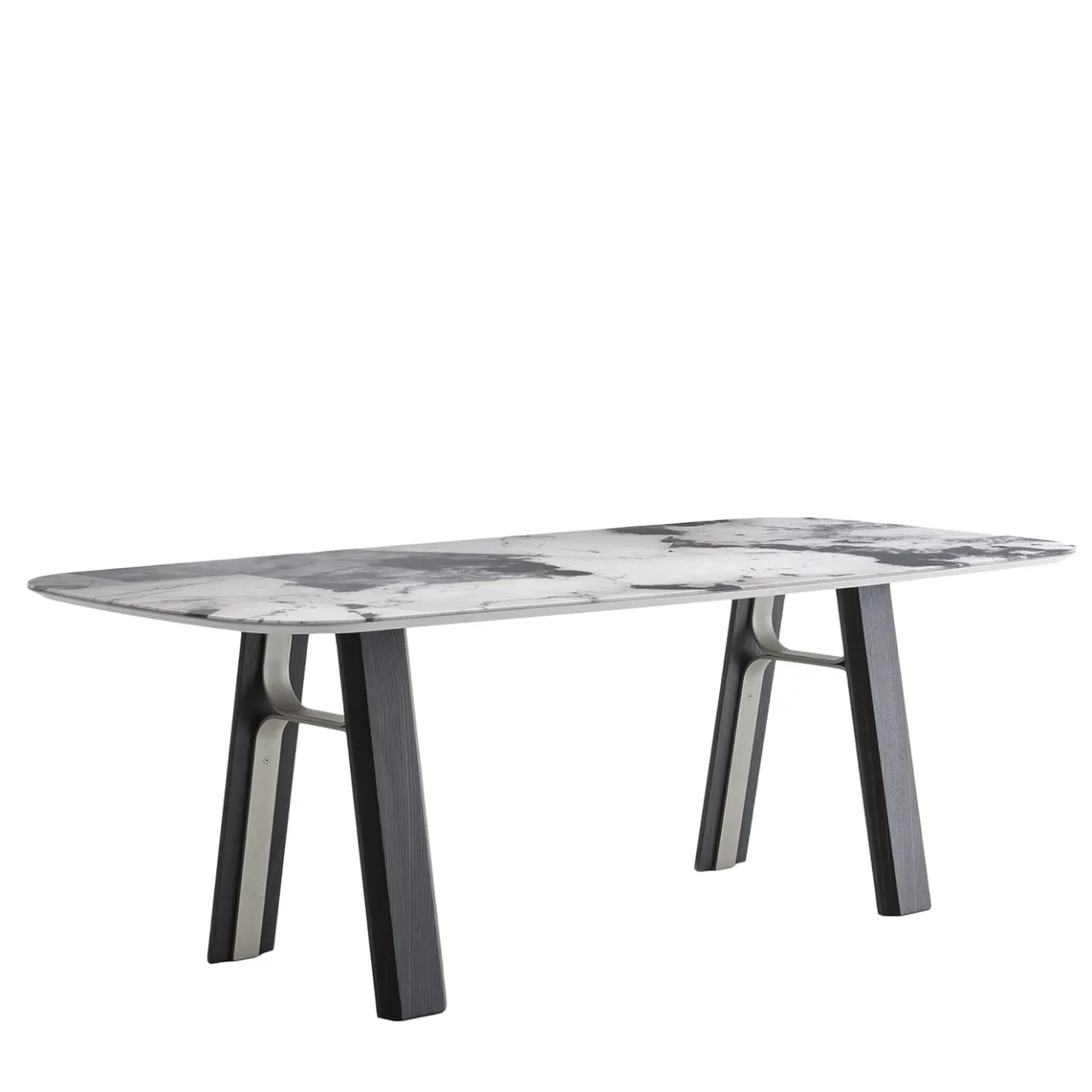 Il marmo Patagonia, con i suoi stupefacenti accenti grafici, è stato scelto per la stampa fedele che questo tavolo presenta sul suo piano in vetro temperato extrachiaro. Sostenuto da audaci gambe in MDF impiallacciate in rovere Laguna e rinforzato da travi metalliche curve – verniciate con polveri epossidiche color champagne – il piano presenta anche un pannello in MDF laccato e smussato a mano su cui aderisce il vetro.