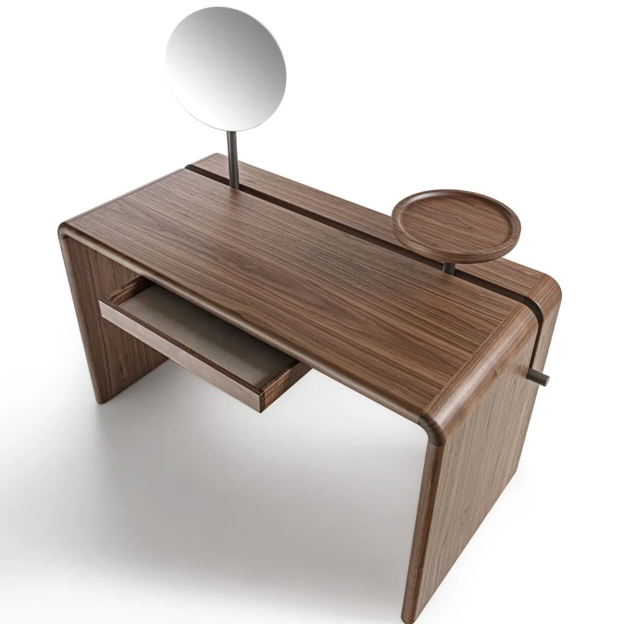 Linee pulite ammorbidite da bordi delicatamente curvi caratterizzano questo prezioso vanity desk. Realizzato in massello di noce canaletto, che colpisce per le sue venature singolari e imprevedibili, è dotato di un sistema cilindrico in metallo rifinito in bronzo che sostiene un vassoio circolare e uno specchio rotondo incorporati in questo pezzo opulento. Un cassetto singolo con fondo rivestito in pelle completa il design.