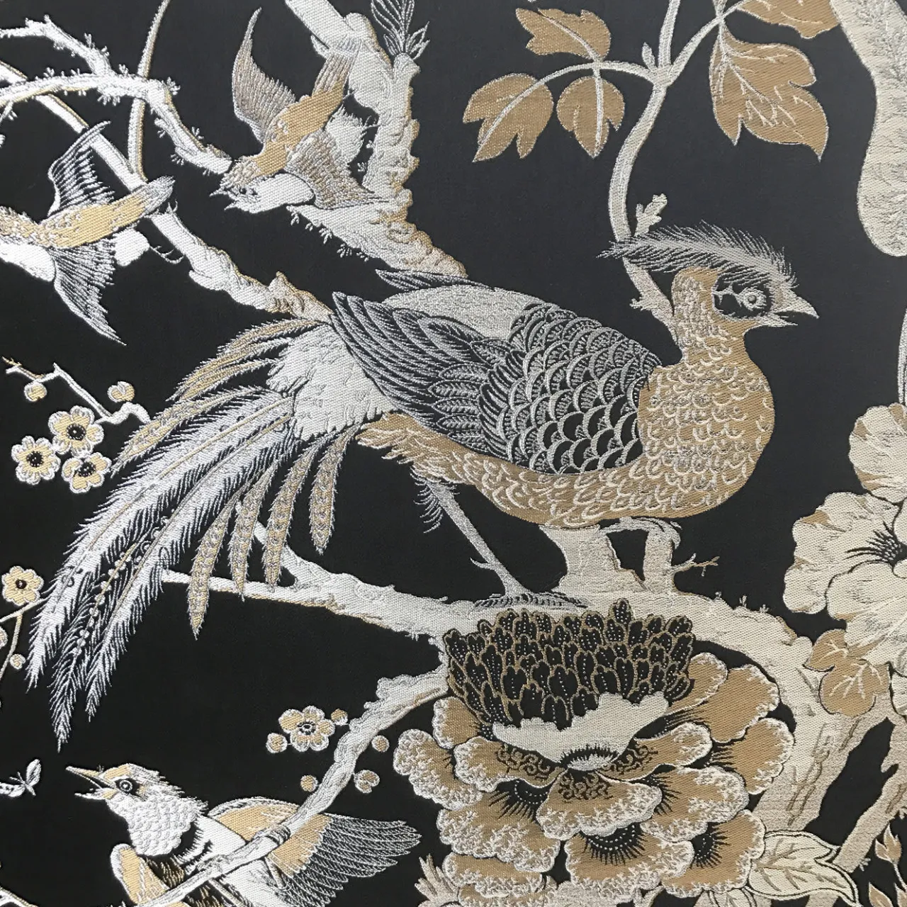 Questo magnifico mobile è stato creato per contenere bevande, bicchieri e biancheria da tavola e arricchirà qualsiasi sala da pranzo, grazie alla sua squisita fattura e all’eleganza del suo design contemporaneo. Interamente realizzato con metodi artigianali, la sua struttura presenta una base aperta in ottone spazzolato che sostiene il corpo con ante in legno rivestite da un prezioso tessuto jacquard di seta ornato da un motivo di uccelli e rami in oro e argento, seta e marrone oro su sfondo nero. All’interno, il mobile presenta due cassetti in legno di noce opaco, un ripiano in vetro extrachiaro e uno specchio posteriore.