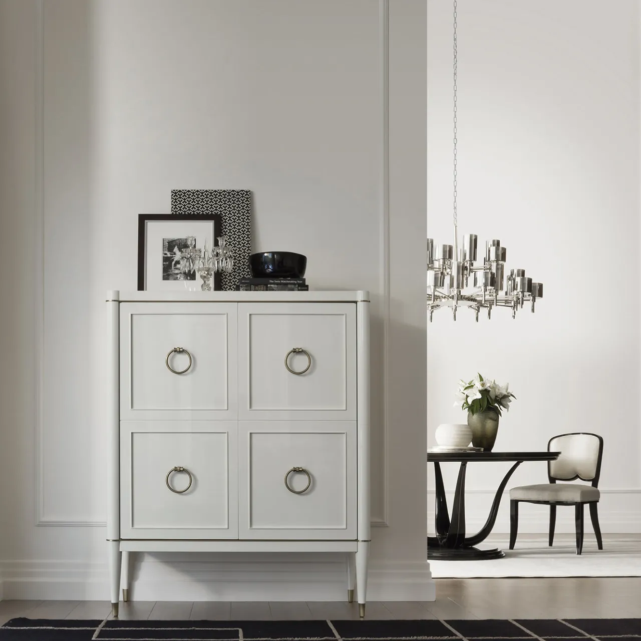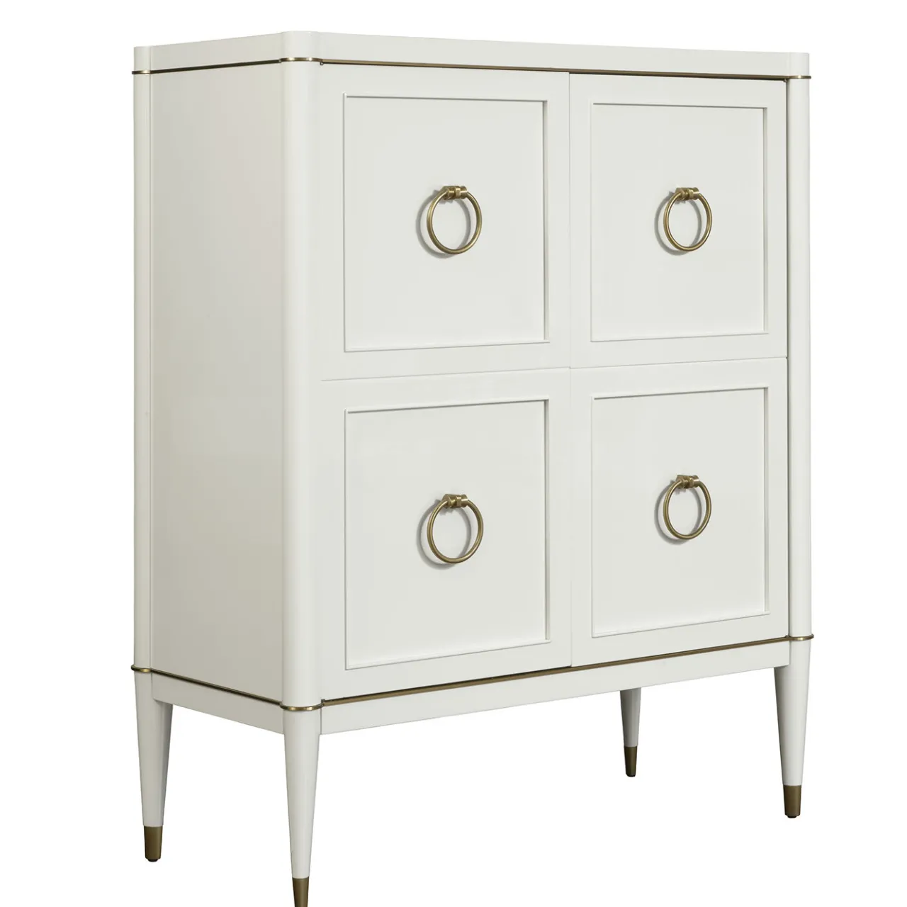 Parte della collezione Ambra, questo mobile bianco è una splendida aggiunta a un arredamento sia classico che moderno. Combinando l’artigianato e i materiali tradizionali con un design lineare e colori vivaci, questo mobile è uno spazio di archiviazione versatile e senza tempo per ogni stanza della casa. La struttura in legno massiccio è impreziosita da una finitura satinata in ottone lungo il perimetro, sui piedi e sulle maniglie. Le ante anteriori vantano una superficie laccata, mentre l’interno è rivestito in ecopelle per un effetto lussuoso. L’accento metallico può avere anche una finitura bronzata.