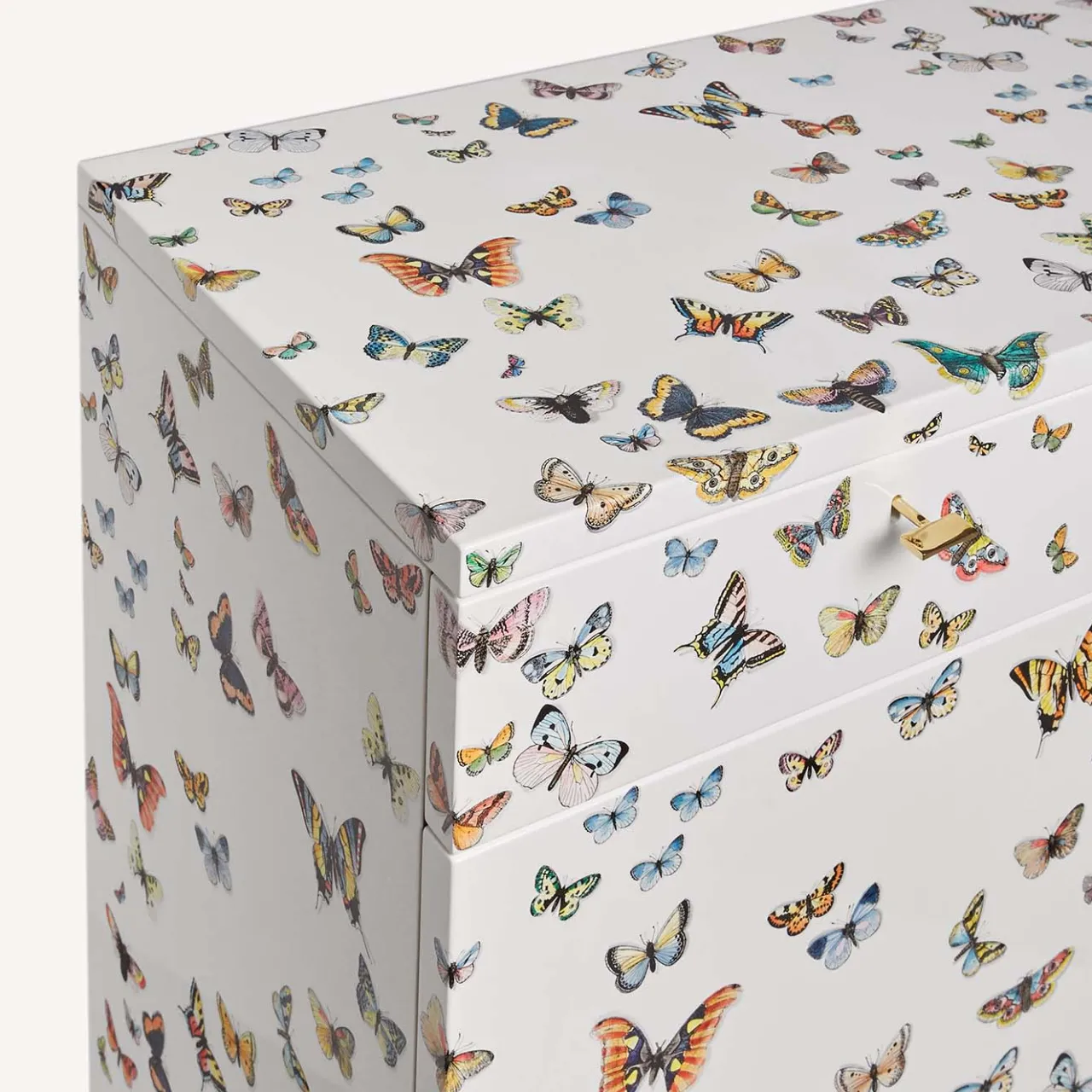 Un grazioso stormo di farfalle si staglia sullo sfondo bianco di questo mobile, che sembra quasi trasportarlo verso il cielo con la forza dell’immaginazione. Serigrafato, dipinto e laccato a mano, il mobile è dotato di gambe in ottone massiccio, due cassetti e due comode ante a battente. Eventuali piccole differenze tra creazioni simili sono il risultato della lavorazione artigianale e testimoniano l’unicità di ogni prodotto.