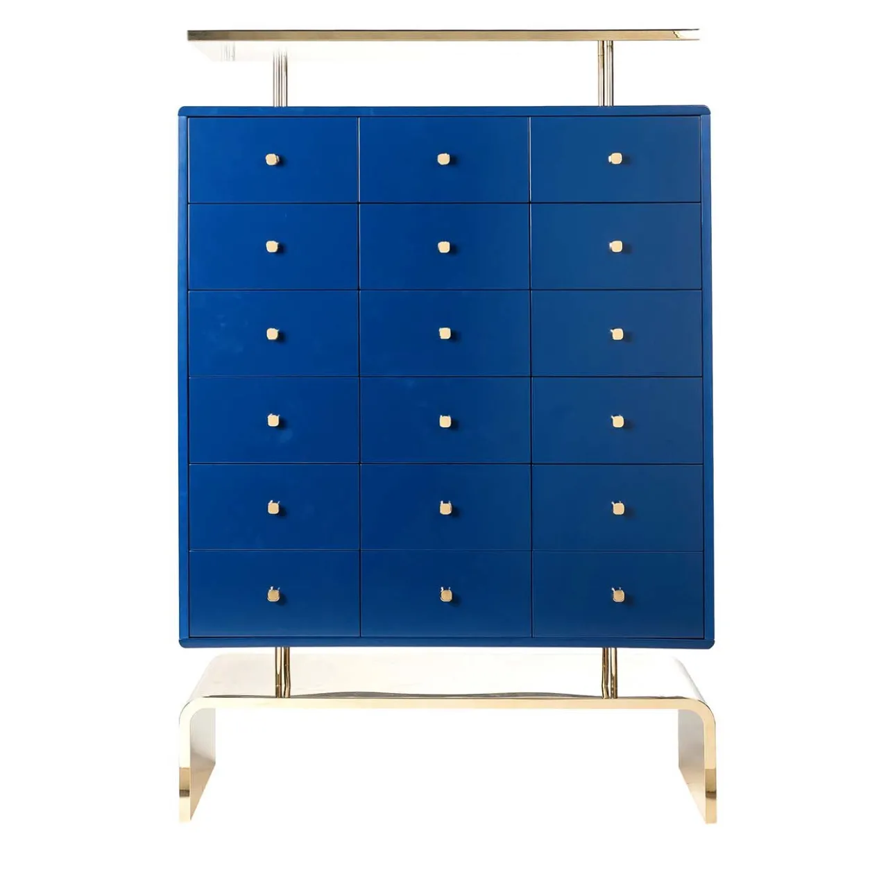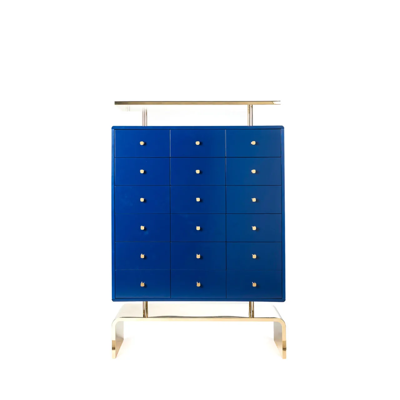 Abbinato all’Auspicious Dresser della stessa suggestiva collezione di Lea Chen, questo mobile creerà un’esposizione unica, fornendo al contempo spazio di archiviazione in qualsiasi stanza della casa. La sua struttura ricorda il mobile da farmacia cinese, chiamato Yaochu, o “mobile dai cento occhi”. Raffinato e moderno, questo pezzo sarà splendido in una casa moderna. La struttura in acciaio è rivestita in oro 24 carati per la base, il piano e le maniglie, mentre il corpo del mobile e i tre cassetti sono laccati in blu opaco all’esterno e in rosso all’interno.