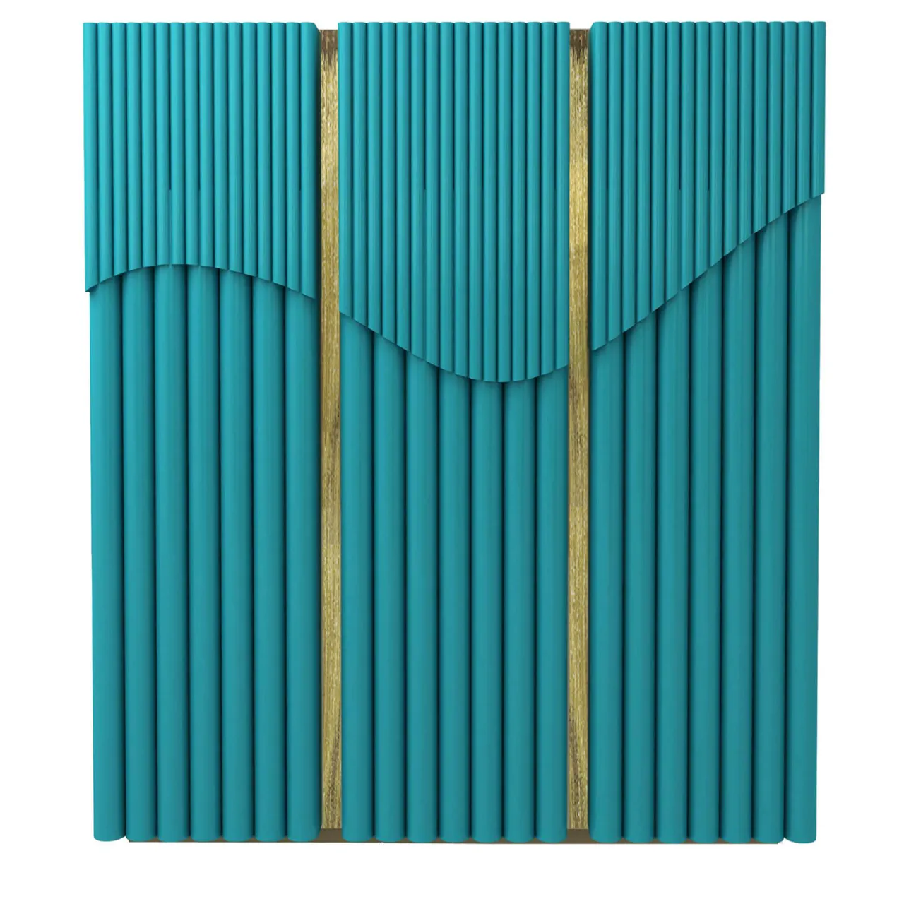 Con una silhouette raffinata e scultorea, questo mobile è un’affascinante aggiunta a un arredamento moderno. Composto da linee delicate e armoniose, è realizzato in legno laccato turchese arricchito da dettagli in ottone dorato. La sua superficie plissettata, che ricorda le tuniche dell’antica Grecia, nasconde un interno prezioso, caratterizzato da due cassetti e da ripiani in vetro trasparente, impreziositi da un luminoso specchio di fondo.