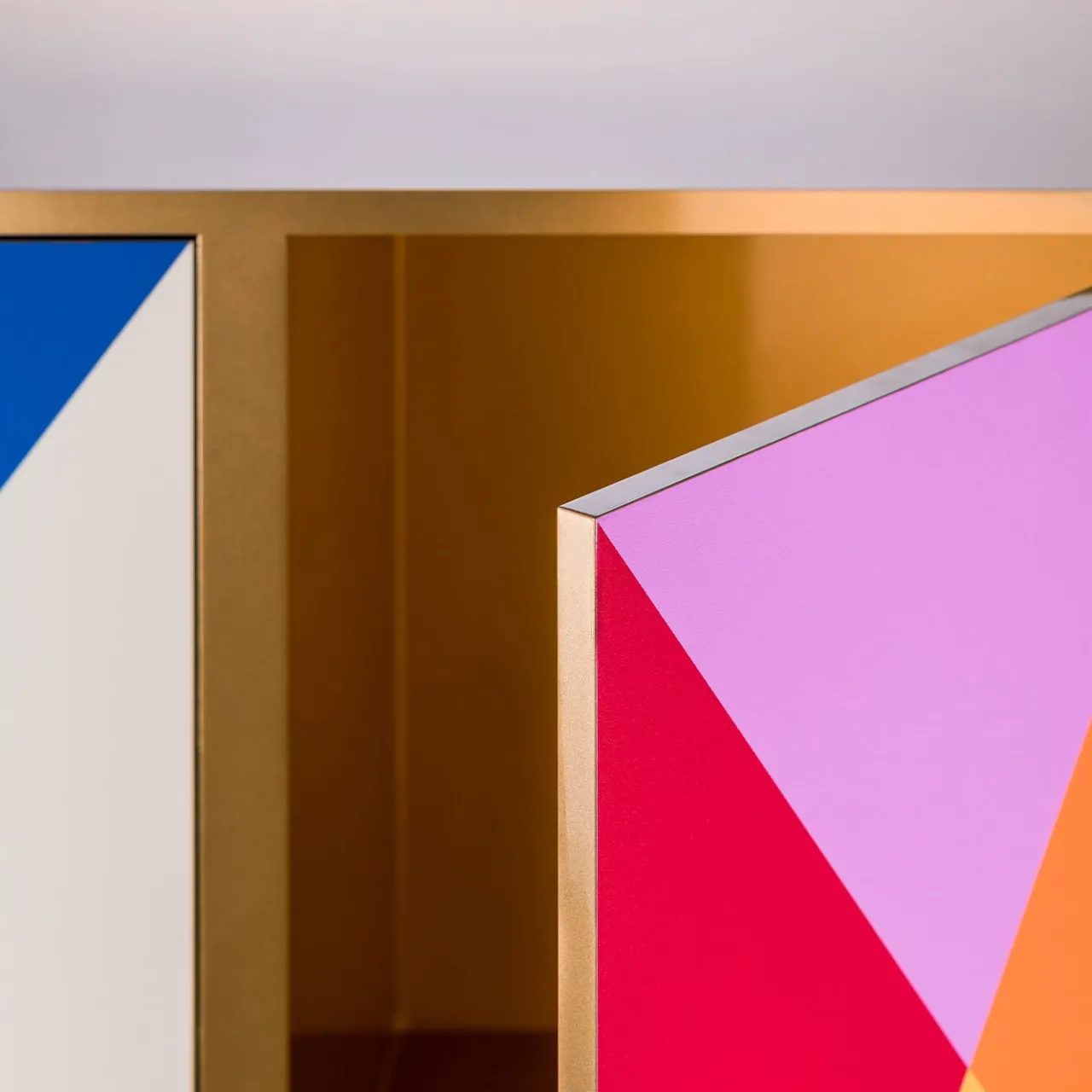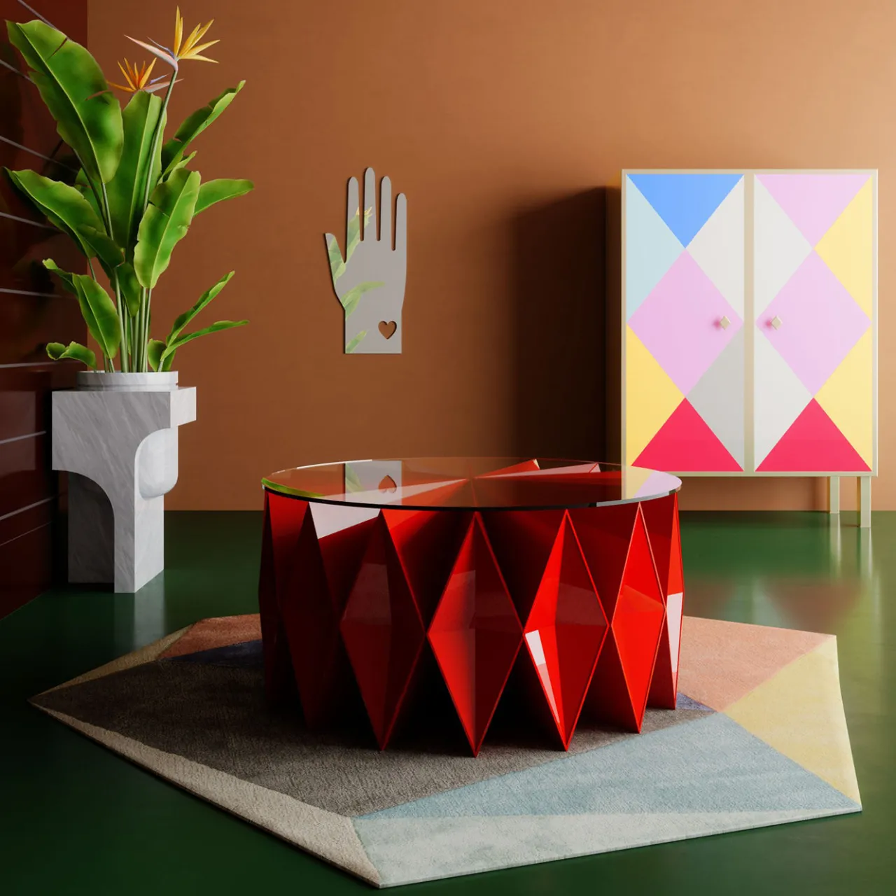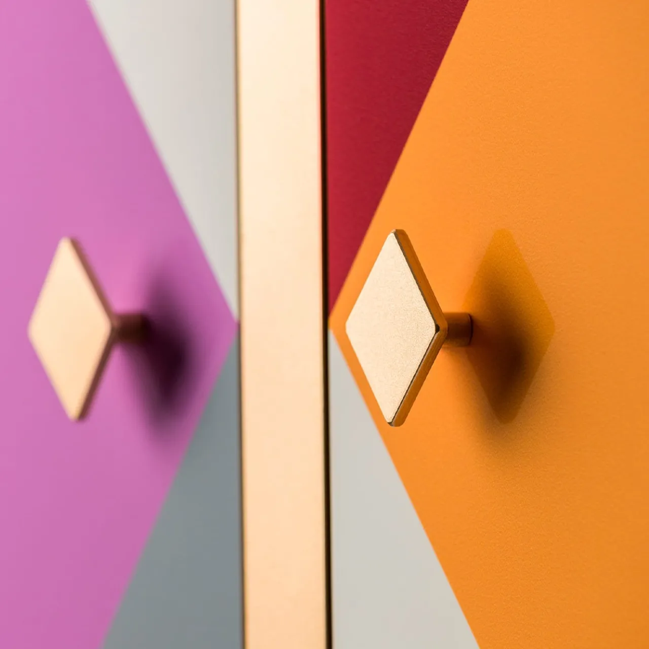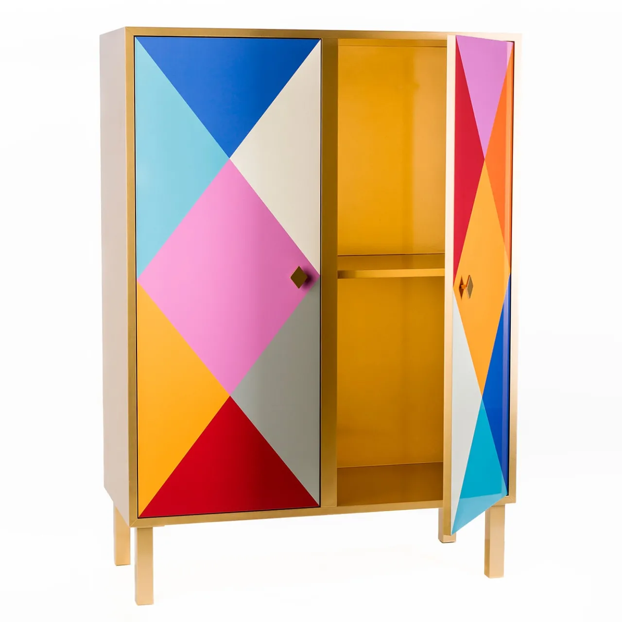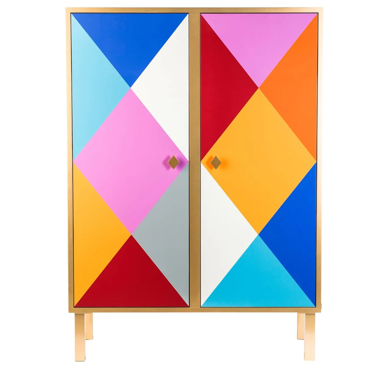 Conservare le stoviglie non potrebbe essere più elegante in questa credenza colorata, dal design raffinato, abilmente realizzata a mano in alluminio pensando alla vibrante atmosfera del Carnevale. Coerenti con la forma delle maniglie, le due ante sfoggiano un ipnotizzante motivo a rombi reso con tonalità brillanti e contrastanti ispirate al costume di Arlecchino. Le gambe rigorosamente scolpite completano il design di questo pezzo su misura.
